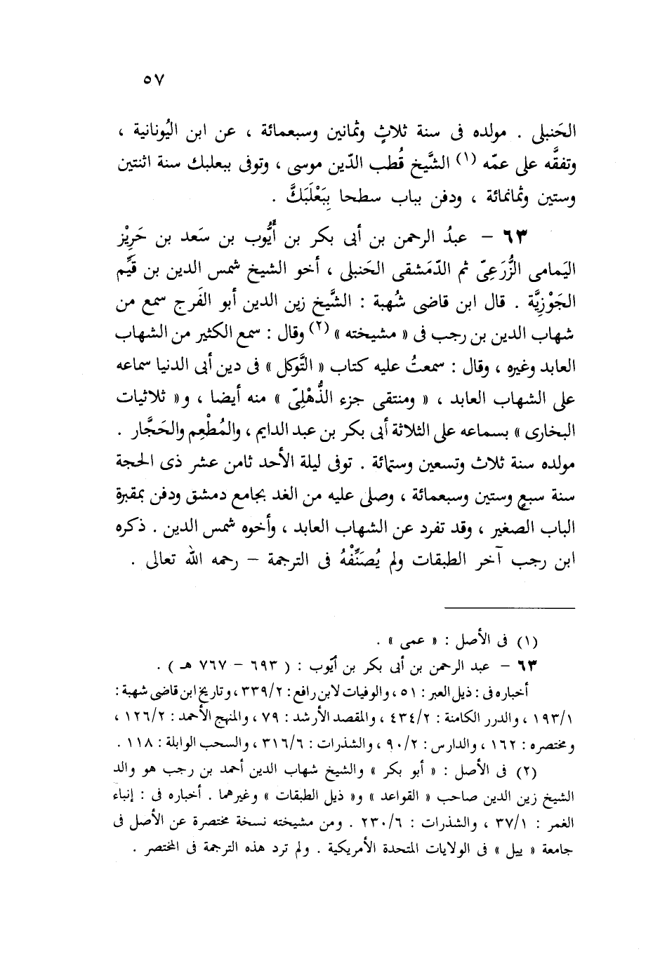 63 - عبدُ الرحمن بن أبي بكر بن أيوب بن سَعد بن حَرِيْز اليَمامى الزُّرَعِىّ ثم الدّمَشقى الحَنبلى، أخو الشيخ شمس الدين بن قيَم الجَوْزِيَّة. قال ابن قاضى شُهبة: الشَّيخ زين الدين أبو الفَرج سمع من شهاب الدين بن رجب فى "مشيخته" (¬2) وقال: سمع الكثير من الشهاب العابد وغيره، وقال: سمعتُ عليه كتاب "التَّوكل" فى دين أبي الدنيا سماعه على الشهاب العابد، "ومنتقى جزء الذُّهْلِىّ" منه أيضًا، و"ثلاثيات البخارى" بسماعه على الثلاثة أبي بكر بن عبد الدايم، والمُطْعِم والحَجَّار. مولده سنة ثلاث تسعين وستمائة. توفى ليلة الأحد ثامن عشر ذى الحجة سنة سبع وستين وسبعمائة، وصلى عليه من الغد بجامع دمشق ودفن بمقبرة الباب الصغير، وقد تفرد عن الشهاب العابد، وأخوه شمس الدين. ذكره ابن رجب آخر الطبقات ولم يُصَنِّفْهُ فى الترجمة - رحمه الله تعالى.