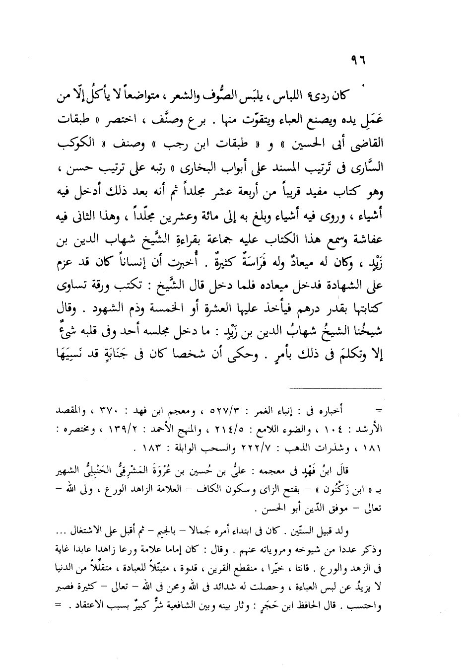 كان ردئ اللباس، يلبَس الصُّوف والشعر، متواضعًا لا يأكلُ إلا من عَمَلِ يده ويصنع العباء ويتقوّت منها. برع وصنَّف، اختصر "طبقات القاضى أبي الحسين" و "طبقات ابن رجب" وصنف "الكوكب السَّارى فى تَرتيب المسند على أبواب البخارى" رتبه على ترتيب حسن، وهو كتاب مفيد قريبًا من أربعة عشر مجلدًا ثم أنه بعد ذلك أدخل فيه أشياء، وروى فيه أشياء وبلغ به إلى مائة وعشرين مجلّدًا، وهذا الثاني فيه عفاشة وسمع هذا الكتاب عليه جماعة بقراءةِ الشَّيخ شهاب الدين بن زيدٍ، وكان له ميعادٌ وله فَرَاسَة كثيرةٌ. أخبرت أن إنسانًا كان قد عزم على الشهادة فدخل ميعاده فلما دخل قال الشيخ: تكتب ورقة تساوى كتابتها بقدر درهم فيأخذ عليها العشرة أو الخمسة وذم الشهود. وقال شيخُنا الشيخُ شهابُ الدين بن زيد: ما دخل مجلسه أحد وفى قلبه شيء إلا وتكلمَ فى ذلك بأمرٍ. وحكى أن شخصا كان فى جَنَابَةٍ قد نَسِيَهَا