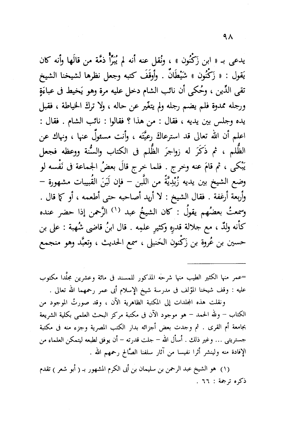 يدعى بـ "ابن زَكْنُون"، ونُقل عنه أنه لم يُبَرأ ذمَّة من قالَها وأنه كان يَقول: "زَكْنُون" شَيْطَانٌ. وأوقَفَ كتبه وجعل نظرها لشيخنا الشيخ تقى الدِّين، وحُكى أن نائب الشام دخل عليه مرة وهو يَخيط فى عباءَةٍ ورجله ممدوة فلم يضم رجله ولم يتغّير عن حاله، ولا تركَ الخياطة، فقبل يده وجلس بين يديه، فقال: من هذا؟ فقالوا: نائب الشام. فقال: اعلم أن الله تعالى قد استرعاكَ رعيَّتَه، وأنت مسئول عنها، ونهاك عن الظلم، ثم ذَكَرَ له زواجرَ الظُّلم فى الكتاب والسُّنة ووعظه فجعل يَبْكى، ثم قامَ عنه وخرج. فلما خرج قالَ بعضُ الجماعة فى نَفْسه لو وضع الشيخ بين يديه زُبْدِيَّةً من اللَّبن - فإن لَبَنَ القُبيبات مشهورة - وأربعة أرغفة. فقال الشيخ: لا أريد أصاحبه حتى أطعمه، أو كما قال. وسمعتُ بعضُهم يقولُ: كان الشيخُ عبد (¬1) الرَّحمن إذا حضر عنده كأنه ولدٌ، مع جلالة قدرِه كثيرِ علمِه. قال ابنُ قاضى شُهبة: على بن حسين بن عُروة بن زَكْنون الحَنبلى، سمع الحديث، وتعبَّد وهو منجمع