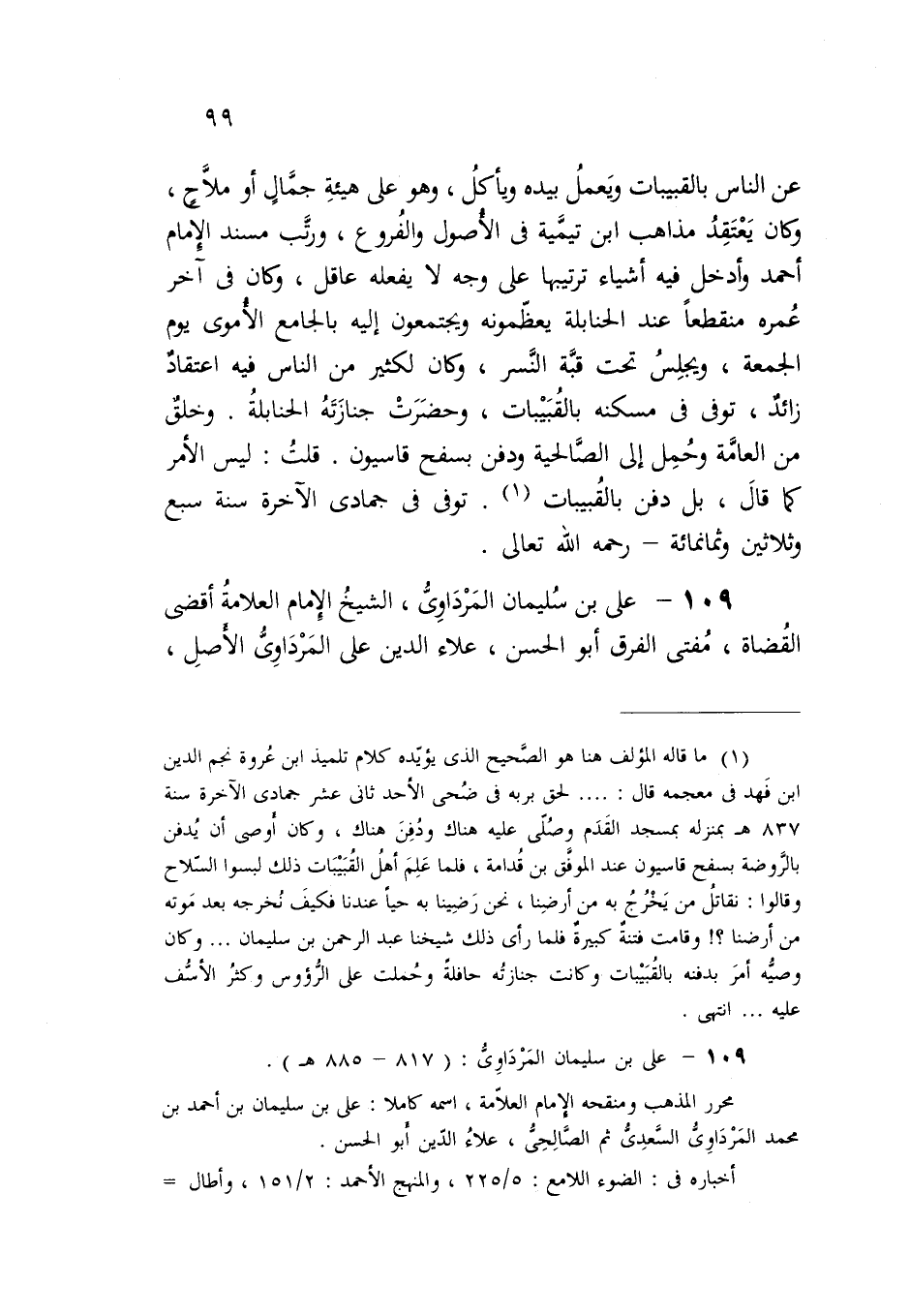 109 - على بن سُليمان المَرْدَاوِىُّ، الشيخُ الِإمام العلامةُ أقضى القُضاة، مُفتى الفرق أبو الحسن، علاء الدين على المَرْدَاوِىُّ الأصلِ،