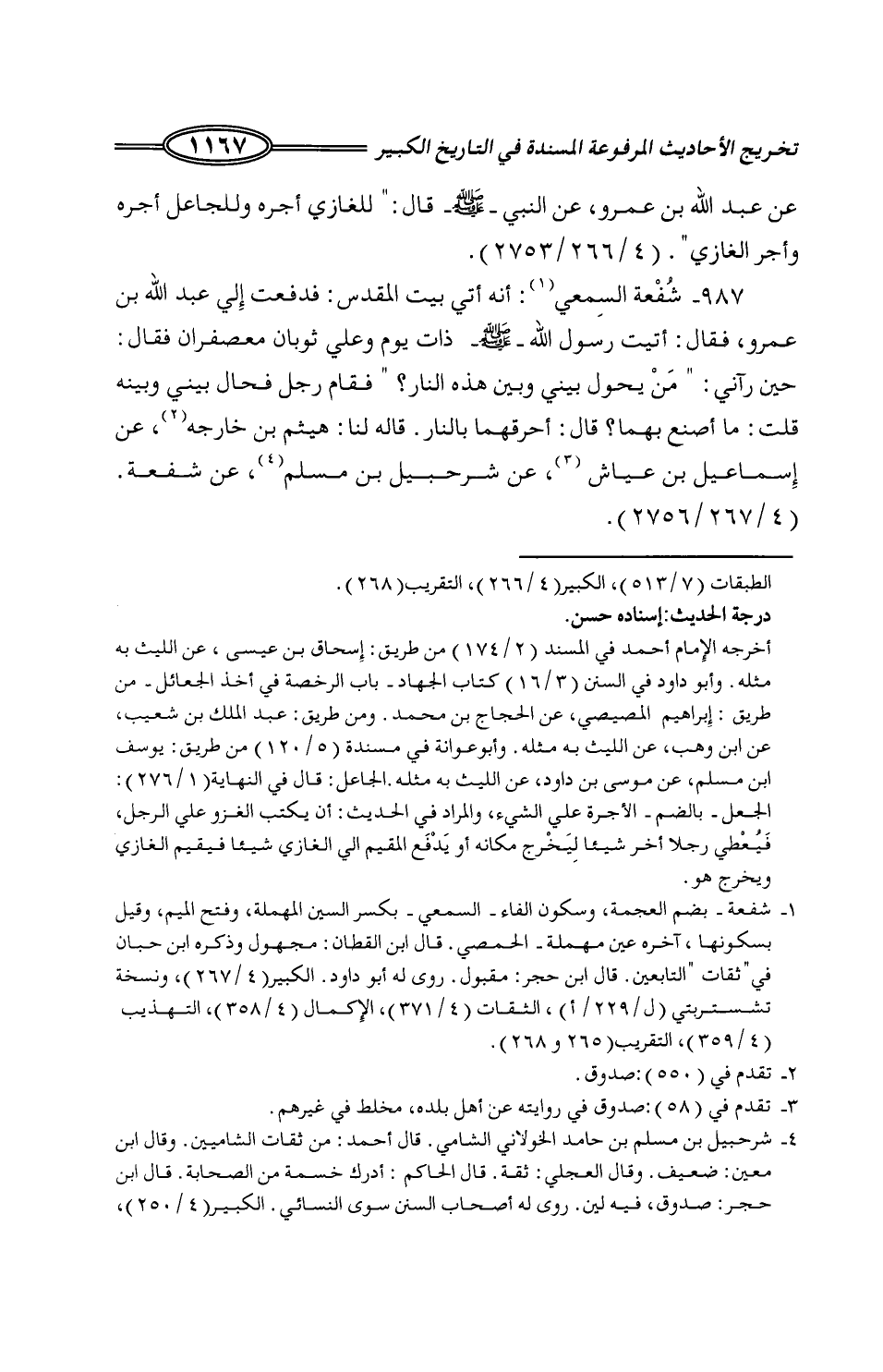 736 - شُفْعَةُ السَّمَعِيُّ: أَنَّهُ أَتَى بَيْتَ الْمَقْدِسِ: فَدَفَعْتُ إِلَى عَبْدِ اللَّهِ بْنِ عَمْرٍو، فَقَالَ: أَتَيْتُ رَسُولَ اللَّهِ صَلَّى اللَّهُ عَلَيْهِ وَسَلَّمَ ذَاتَ يَوْمٍ وَعَلَيَّ ثَوْبَانِ مُعَصْفَرَانِ فَقَالَ حِينَ رَآنِي: «§مَنْ يَحُولُ بَيْنِي وَبَيْنَ هَذِهِ النَّارِ؟» فَقَامَ رَجُلٌ فَحَالَ بَيْنِي وَبَيْنَهُ، قُلْتُ: مَا أَصْنَعُ بِهِمَا؟ قَالَ: «أَحْرِقْهُمَا بِالنَّارِ» قَالَهُ لَنَا هَيْثَمُ بْنُ خَارِجَةَ: عَنْ إِسْمَاعِيلَ بْنِ عَيَّاشٍ، عَنْ شُرَحْبِيلَ بْنِ مُسْلِمٍ، عَنْ شُفْعَةَ