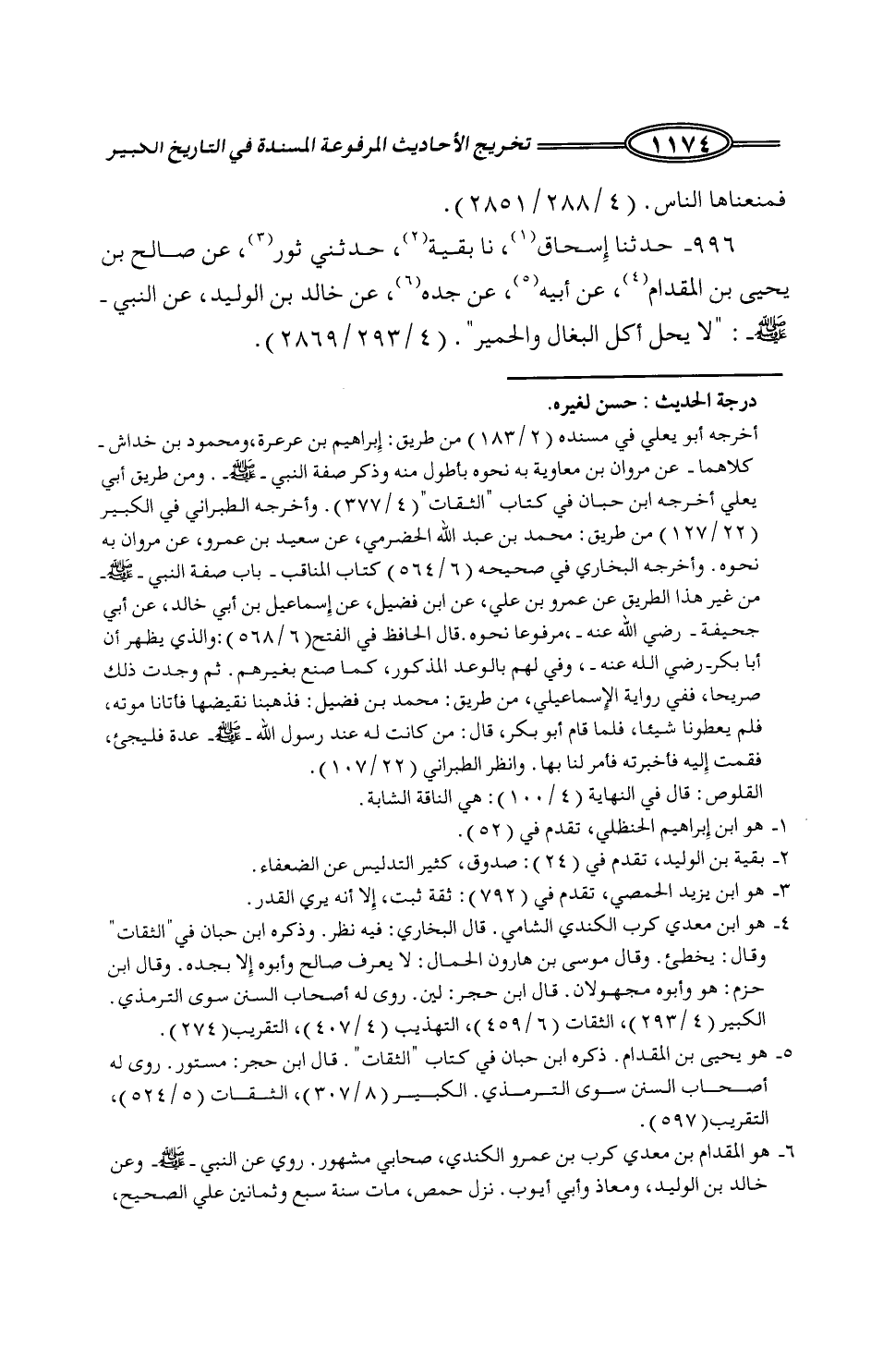 745 - حَدَّثَنَا إِسْحَاقُ، نا بَقِيَّةُ، حَدَّثَنِي ثَوْرٌ، عَنْ صَالِحِ بْنِ يَحْيَى بْنِ الْمِقْدَامِ، عَنْ أَبِيهِ، عَنْ جَدِّهِ، عَنْ خَالِدِ بْنِ الْوَلِيدِ، عَنِ النَّبِيِّ صَلَّى اللَّهُ عَلَيْهِ وَسَلَّمَ: «§لَا يَحِلُّ أَكْلُ الْبِغَالِ وَالْحَمِيرِ»