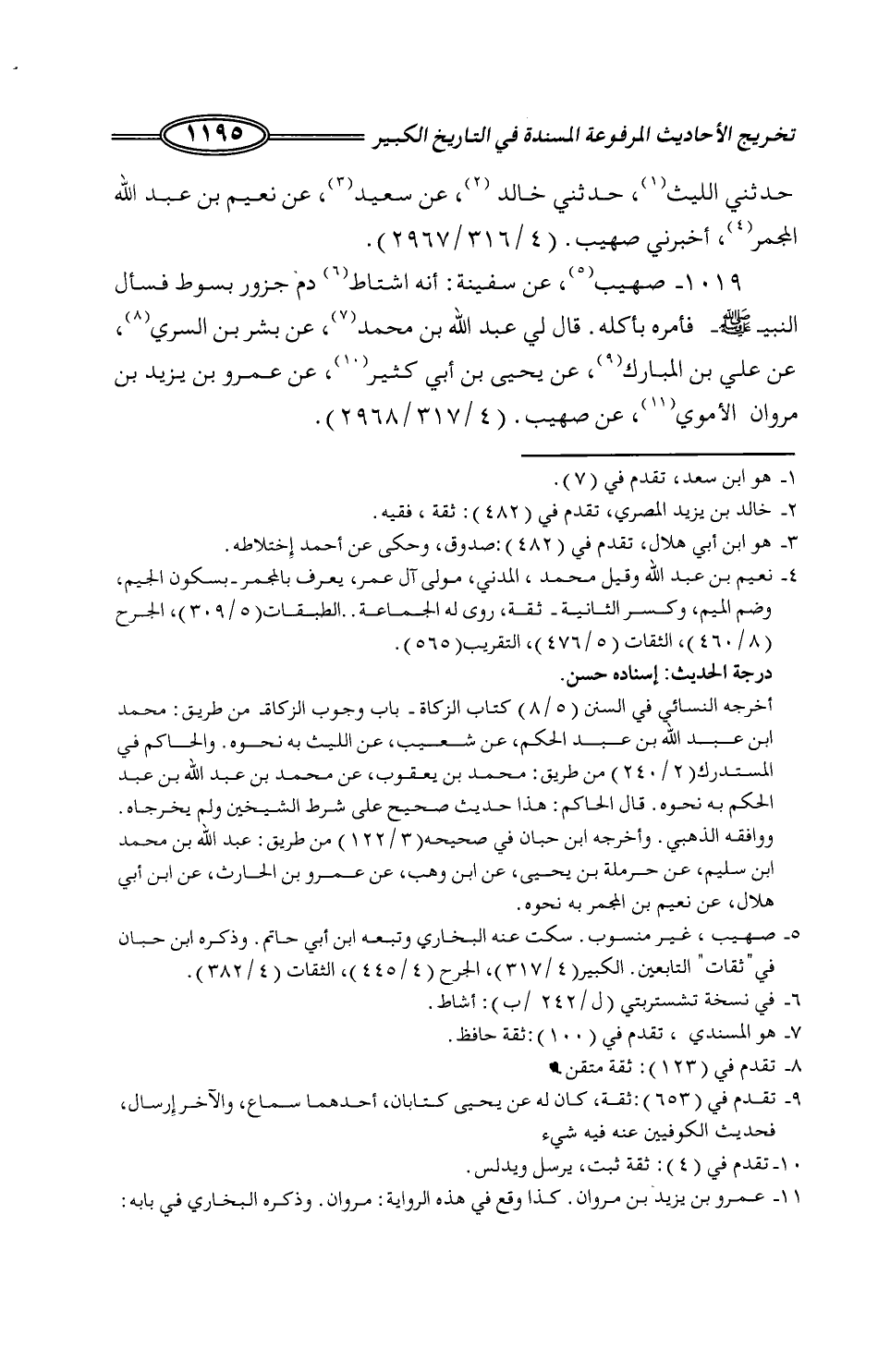 769 - صُهَيْبٌ، عَنْ سَفِينَةَ: «أَنَّهُ §اشْتَاطَ دَمَ جَزُورٍ بِسَوْطٍ، فَسَأَلَ النَّبِيَّ صَلَّى اللَّهُ عَلَيْهِ وَسَلَّمَ، فَأَمَرَهُ بِأَكْلِهِ» قَالَ لِي عَبْدُ اللَّهِ بْنُ مُحَمَّدٍ: عَنْ بِشْرِ بْنِ السَّرِيِّ، عَنْ عَلِيِّ بْنِ الْمُبَارَكِ، عَنْ يَحْيَى بْنِ أَبِي كَثِيرٍ، عَنْ عَمْرِو بْنِ يَزِيدَ بْنِ هَارُوْنَ الْأُمَوِيِّ، عَنْ صُهَيْبٍ، -[1196]- حَدَّثَنِي حَسَنُ بْنُ خَلَفٍ، نا إِسْحَاقُ، عَنْ شَرِيكٍ، عَنْ سِمَاكٍ، عَنْ صُبَيْحِ بْنِ عَبْدِ اللَّهِ الْعَبْسِيِّ، قَالَ: -[1197]- اسْتَعْمَلَ عُثْمَانُ أَبَا سُفْيَانَ بْنَ الْحَارِثِ عَلَى الْعَرُوضِ. فَذَكَرَ قِصَّةَ عُثْمَانَ وَعَلِيٍّ فِي الصَّيْدِ