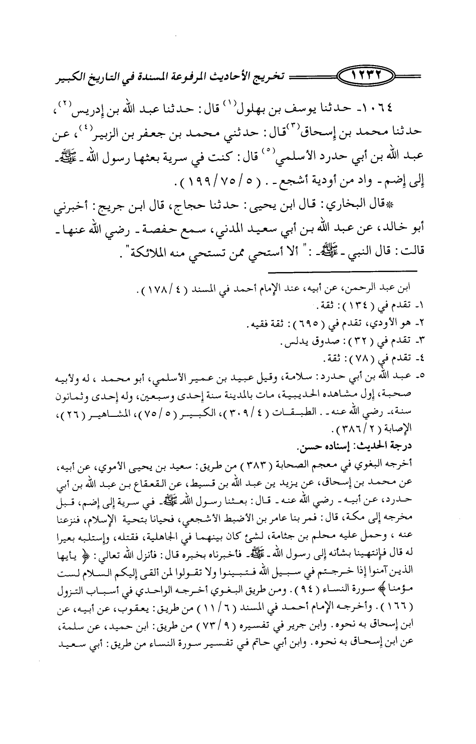 795 - حَدَّثَنَا يُوسُفُ بْنُ بُهْلُولٍ قَالَ: حَدَّثَنَا عَبْدُ اللَّهِ بْنُ إِدْرِيسَ، حَدَّثَنَا مُحَمَّدُ بْنُ إِسْحَاقَ قَالَ: حَدَّثَنِي مُحَمَّدُ بْنُ جَعْفَرِ بْنِ الزُّبَيْرِ، عَنْ عَبْدِ اللَّهِ بْنِ أَبِي حَدْرَدٍ الْأَسْلَمِيِّ قَالَ: «§كُنْتُ فِي سَرِيَّةٍ بَعَثَهَا رَسُولُ اللَّهِ صَلَّى اللَّهُ عَلَيْهِ وَسَلَّمَ إِلَى إِضَمٍ» وَادٍ مِنْ أَوْدِيَةِ أَشْجَعَ