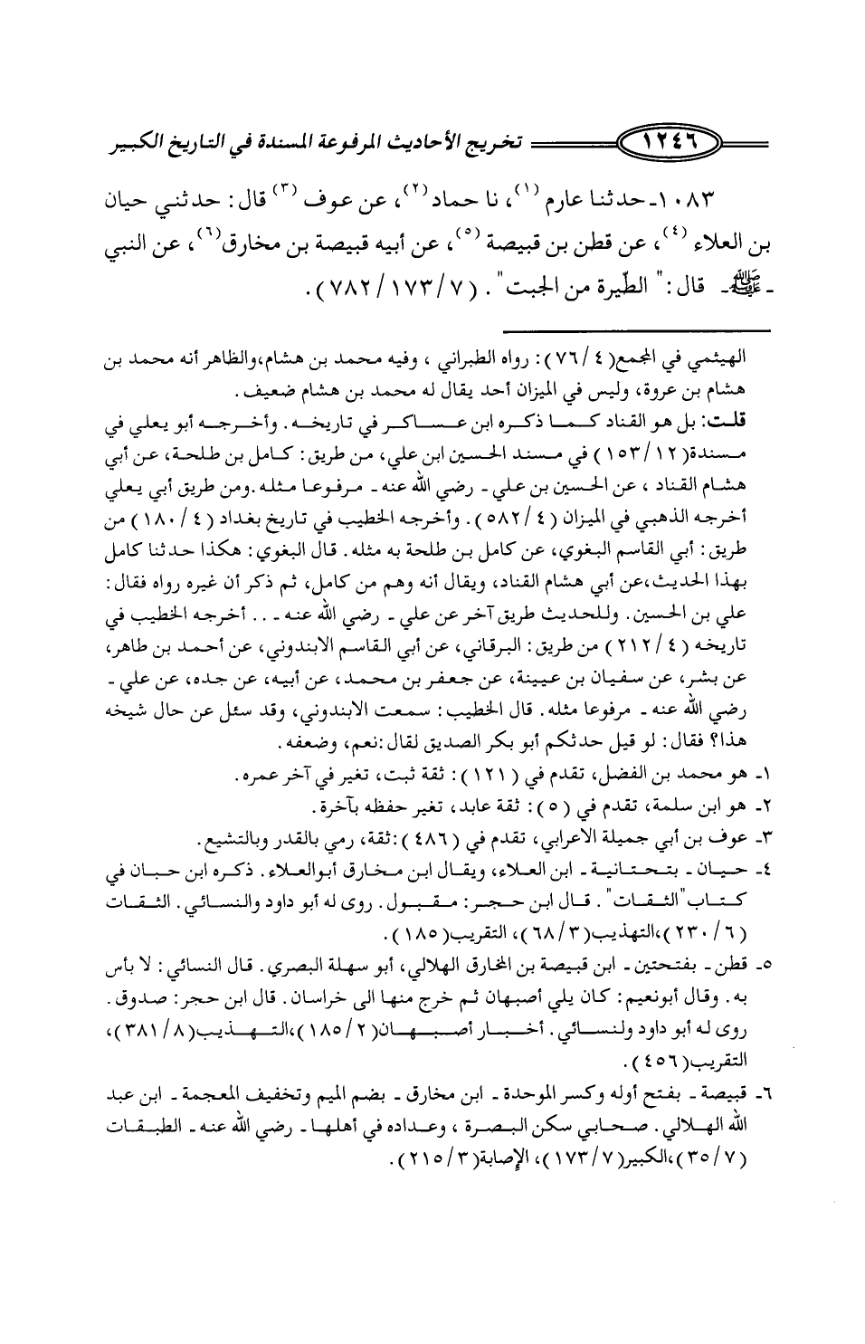 809 - حَدَّثَنَا عَارِمٌ، نا حَمَّادٌ، عَنْ عَوْفٍ قَالَ: حَدَّثَنِي حَيَّانُ بْنُ الْعَلَاءِ، عَنْ قَطَنِ بْنِ قَبِيصَةَ، عَنْ أَبِيهِ قَبِيصَةَ بْنِ مُخَارِقٍ، عَنِ النَّبِيِّ صَلَّى اللَّهُ عَلَيْهِ وَسَلَّمَ قَالَ: «§الطِّيَرَةُ مِنَ الْجِبِتِ»