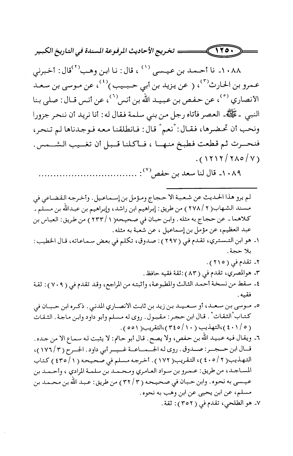 814 - نا أَحْمَدُ بْنُ عِيسَى قَالَ: نا ابْنُ وَهْبٍ قَالَ: أَخْبَرَنِي عَمْرُو بْنُ الْحَارِثِ، عَنْ يَزِيدَ بْنِ أَبِي حَبِيبٍ، عَنْ مُوسَى بْنِ سَعْدٍ الْأَنْصَارِيِّ، عَنْ حَفْصِ بْنِ عُبَيْدِ اللَّهِ بْنِ أَنَسٍ، عَنْ أَنَسِ، قَالَ: صَلَّى بِنَا النَّبِيُّ صَلَّى اللَّهُ عَلَيْهِ وَسَلَّمَ الْعَصْرَ فَأَتَاهُ رَجُلٌ مِنْ بَنِي سَلِمَةَ فَقَالَ لَهُ: إِنَّا §نُرِيدُ أَنْ نَنْحَرَ جَزُورًا وَنُحِبُّ أَنْ تَحْضُرَهَا، فَقَالَ: «نَعَمْ» قَالَ: فَانْطَلَقْنَا مَعَهُ فَوَجَدْنَاهَا لَمْ تُنْحَرْ، فَنُحِرَتْ ثُمَّ قُطِّعَتْ فَطُبِخَ مِنْهَا، فَأَكَلْنَا قَبْلَ أَنْ تَغِيبَ الشَّمْسُ