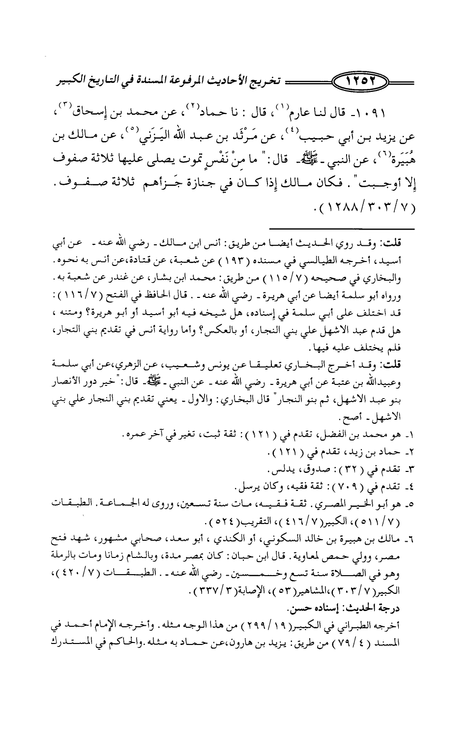 816 - قَالَ لَنَا عَارِمٌ، قَالَ: نا حَمَّادٌ، عَنْ مُحَمَّدِ بْنِ إِسْحَاقَ، عَنْ يَزِيدَ بْنِ أَبِي حَبِيبٍ، عَنْ مَرْثَدِ بْنِ عَبْدِ اللَّهِ الْيَزَنِيِّ، عَنْ مَالِكِ بْنِ هُبَيْرَةَ، عَنِ النَّبِيِّ صَلَّى اللَّهُ عَلَيْهِ وَسَلَّمَ قَالَ: «§مَا مِنْ نَفْسٍ تَمُوتُ يُصَلِّي عَلَيْهَا ثَلَاثَةُ صُفُوفٍ إِلَّا أَوْجَبَتْ» فَكَانَ مَالِكٌ، إِذَا كَانَ فِي جِنَازَةٍ جَزَّأَهُمْ ثَلَاثَةَ صُفُوفٍ "