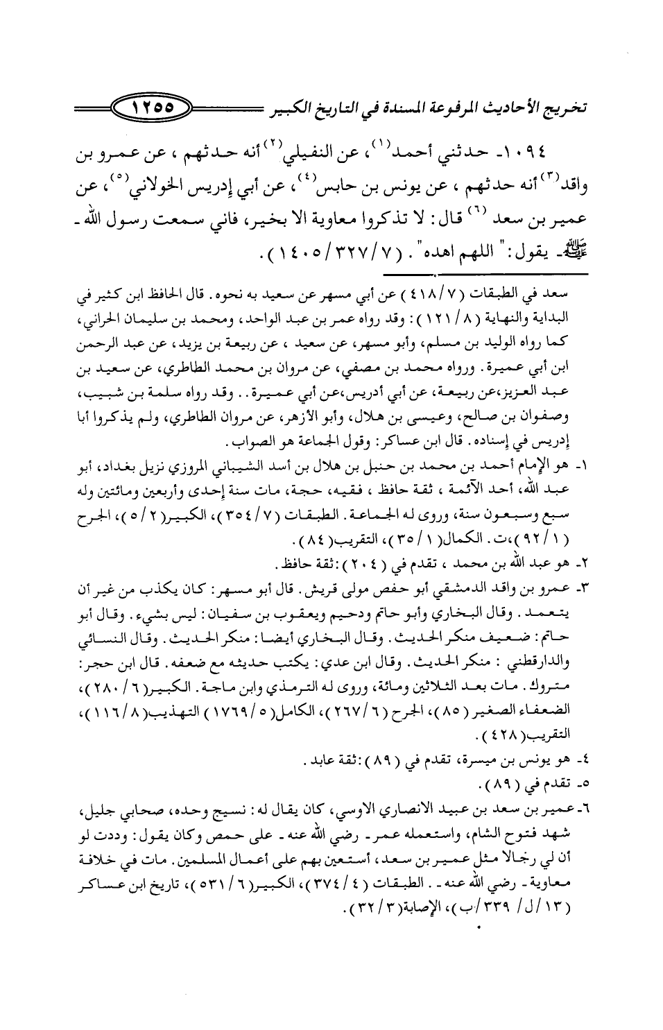 819 - حَدَّثَنِي أَحْمَدُ، عَنِ النُّفَيْلِيِّ أَنَّهُ حَدَّثَهُمْ، عَنْ عَمْرِو بْنِ وَاقِدٍ أَنَّهُ حَدَّثَهُمْ، عَنْ يُونُسَ بْنِ حَلْبَسٍ، عَنْ أَبِي إِدْرِيسَ الْخَوْلَانِيِّ، عَنْ عُمَيْرِ بْنِ سَعْدٍ قَالَ: لَا تَذْكُرُوا مُعَاوِيَةَ إِلَّا بِخَيْرٍ، فَإِنِّي سَمِعْتُ رَسُولَ اللَّهِ صَلَّى اللَّهُ عَلَيْهِ وَسَلَّمَ يَقُولُ: «§اللَّهُمَّ اهْدِهِ»