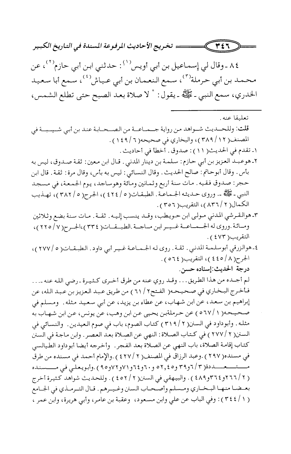59 - وَقَالَ لِي إِسْمَاعِيلُ بْنُ أَبِي أُوَيْسٍ: حَدَّثَنِي ابْنُ أَبِي حَازِمٍ، عَنْ مُحَمَّدِ بْنِ أَبِي حَرْمَلَةَ، سَمِعَ النُّعْمَانَ بْنَ أَبِي عَيَّاشٍ، سَمِعَ أَبَا سَعِيدٍ الْخُدْرِيَّ، سَمِعَ النَّبِيَّ صَلَّى اللَّهُ عَلَيْهِ وَسَلَّمَ يَقُولُ: «§لَا صَلَاةَ بَعْدَ الصُّبْحِ، حَتَّى تَطْلُعَ الشَّمْسُ، -[347]- وَلَا بَعْدَ الْعَصْرِ حَتَّى تَغْرُبَ الشَّمْسُ»