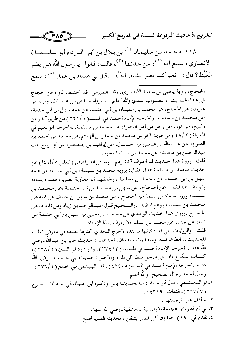 82 - مُحَمَّدُ بْنُ سُلَيْمَانَ بْنِ بِلَالِ بْنِ أَبِي الدَّرْدَاءِ أَبُو سُلَيْمَانَ الْأَنْصَارِيُّ، سَمِعَ أُمَّهُ، عَنْ جَدَّتِهَا، قَالَتْ: قَالُوا: يَا رَسُولَ اللَّهِ §هَلْ يَضُرُّ الْغَبْطُ؟ قَالَ: «نَعَمْ كَمَا يَضُرُّ الشَّجَرَ الْخَبْطُ» قَالَ لِي هِشَامُ بْنُ عَمَّارٍ: سَمِعَ -[386]- مُحَمَّدًا