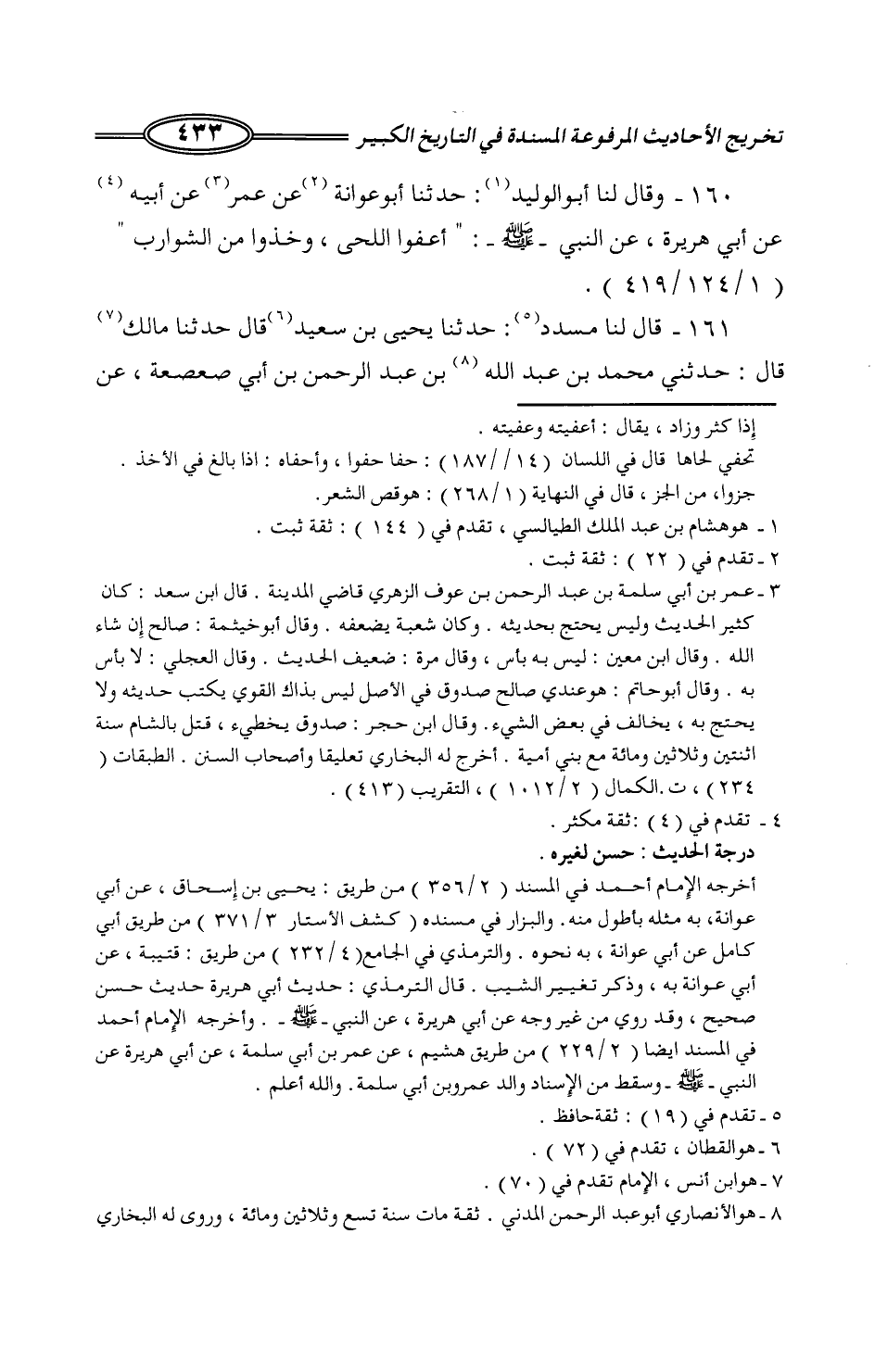 116 - وَقَالَ لَنَا أَبُو الْوَلِيدِ: حَدَّثَنَا أَبُو عَوَانَةَ، عَنْ عُمَرَ، عَنْ أَبِيهِ، عَنْ أَبِي هُرَيْرَةَ، عَنِ النَّبِيِّ صَلَّى اللَّهُ عَلَيْهِ وَسَلَّمَ: «§أَعْفُوا اللِّحَى، وَخُذُوا مِنَ الشَّوَارِبِ»