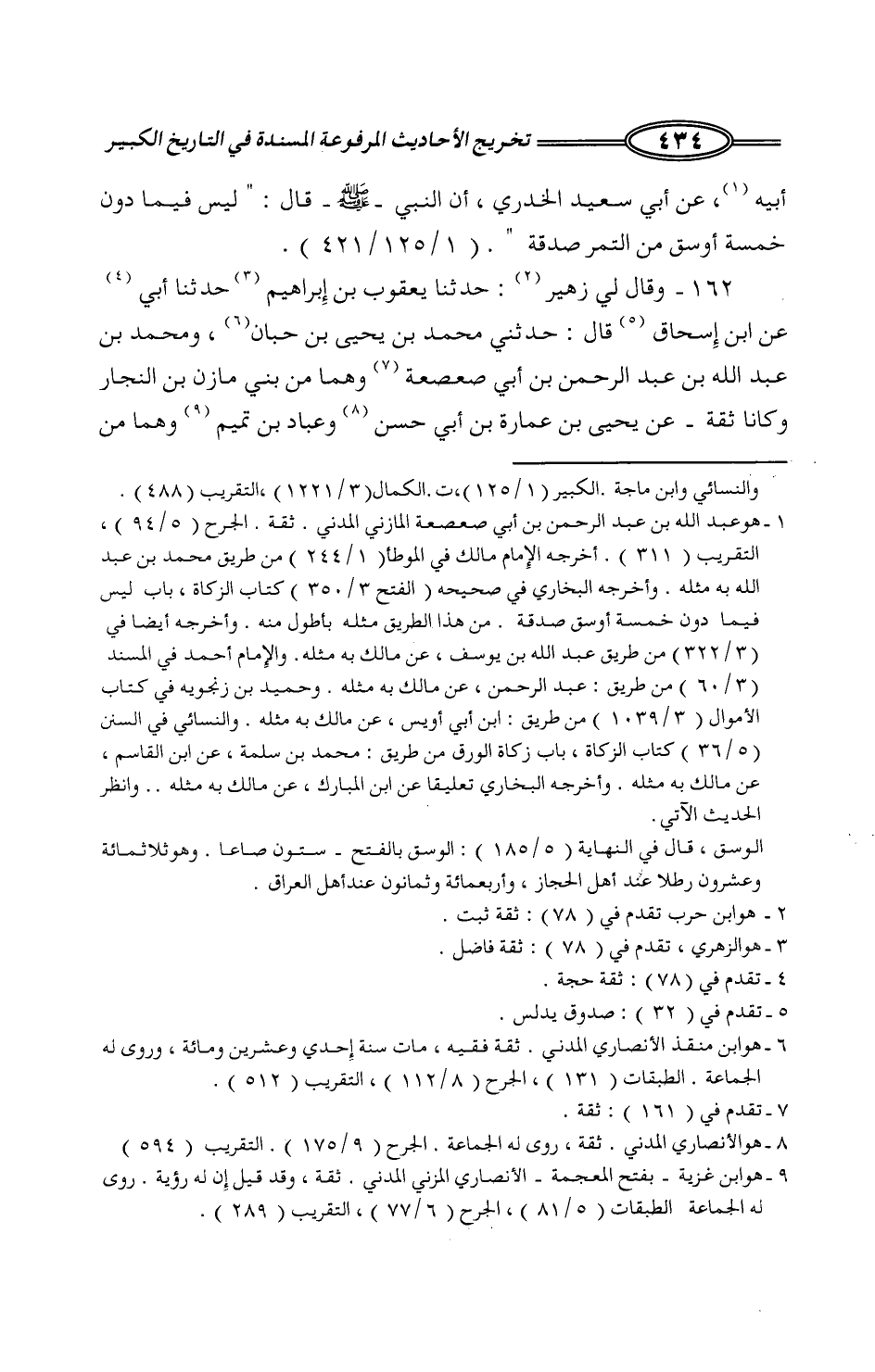 118 - وَقَالَ لِي زُهَيْرٌ: حَدَّثَنَا يَعْقُوبُ بْنُ إِبْرَاهِيمَ، حَدَّثَنَا أَبِي، عَنِ ابْنِ إِسْحَاقَ، قَالَ: حَدَّثَنِي مُحَمَّدُ بْنُ يَحْيَى بْنِ حَبَّانَ، وَمُحَمَّدُ بْنُ عَبْدِ اللَّهِ بْنِ عَبْدِ الرَّحْمَنِ بْنِ أَبِي صَعْصَعَةَ، وَهُمَا مِنْ بَنِي مَازِنِ بْنِ النَّجَّارِ، وَكَانَا ثِقَةً، عَنْ يَحْيَى بْنِ عُمَارَةَ بْنِ أَبِي حَسَنٍ، وَعَبَّادِ بْنِ تَمِيمٍ، وَهُمَا مِنْ -[435]- رَهْطِهِمَا، وَكَانَا ثِقَةً، عَنْ أَبِي سَعِيدٍ الْخُدْرِيِّ، سَمِعَ النَّبِيَّ صَلَّى اللَّهُ عَلَيْهِ وَسَلَّمَ قَالَ: «§لَيْسَ فِيمَا دُونَ خَمْسَةِ أَوْسُقٍ مِنَ التَّمْرِ صَدَقَةٌ»