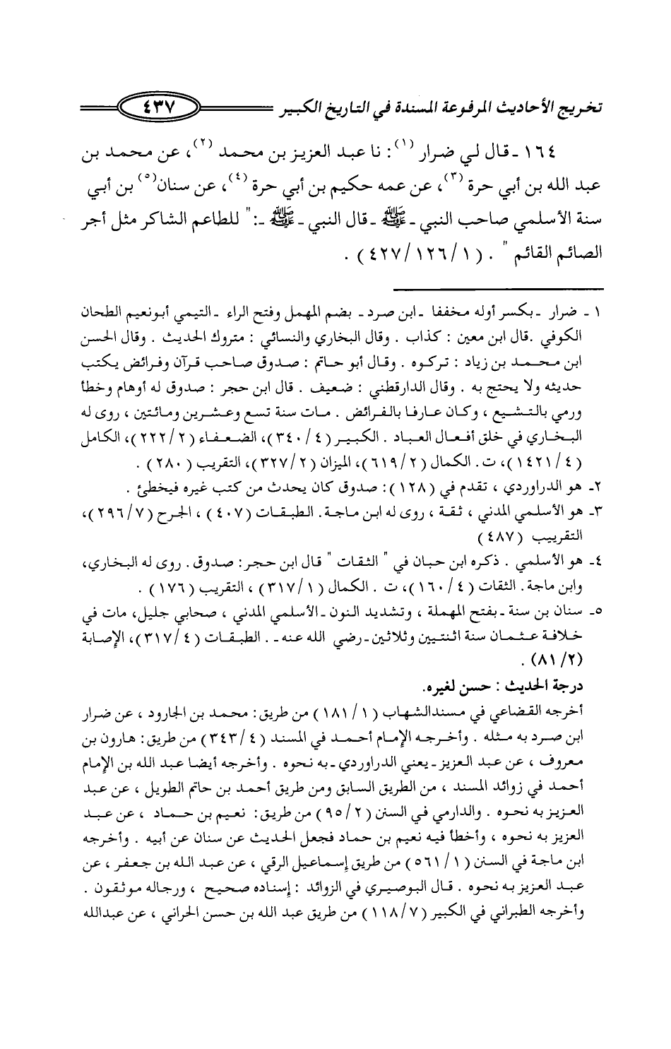 120 - قَالَ لِي ضِرَارٌ: نا عَبْدُ الْعَزِيزِ بْنُ مُحَمَّدٍ، عَنْ مُحَمَّدِ بْنِ عَبْدِ اللَّهِ بْنِ أَبِي حُرَّةَ، عَنْ عَمِّهِ حَكِيمِ بْنِ أَبِي حُرَّةَ، عَنْ سِنَانِ بْنِ سَنَّةَ الْأَسْلَمِيِّ، صَاحِبِ النَّبِيِّ صَلَّى اللَّهُ عَلَيْهِ وَسَلَّمَ، قَالَ النَّبِيُّ صَلَّى اللَّهُ عَلَيْهِ وَسَلَّمَ: «§لِلطَّاعِمِ الشَّاكِرِ مِثْلُ أَجْرِ الصَّائِمِ الْقَائِمِ» -[438]- وَقَالَ لَنَا إِسْمَاعِيلُ بْنُ أَبِي أُوَيْسٍ: عَنْ سُلَيْمَانَ بْنِ بِلَالٍ، عَنْ مُحَمَّدِ بْنِ عَبْدِ اللَّهِ بْنِ أَبِي حُرَّةَ، عَنْ عَمِّهِ حَكِيمِ بْنِ أَبِي حُرَّةَ، عَنْ سَلْمَانَ الْأَغَرِّ، عَنْ أَبِي هُرَيْرَةَ، قَالَ: لَا أَعْلَمُهُ إِلَّا عَنِ النَّبِيِّ صَلَّى اللَّهُ عَلَيْهِ وَسَلَّمَ مِثْلَهُ. -[439]- حَدَّثَنِي ابْنُ أَبِي الْأَسْوَدِ، قَالَ: حَدَّثَنَا عَبْدُ الْعَزِيزِ بْنُ مُحَمَّدٍ، عَنْ مُحَمَّدِ بْنِ عَبْدِ اللَّهِ بْنِ أَبِي حُرَّةَ، عَنْ أَبِيهِ، عَنْ سِنَانِ بْنِ سَنَّةَ، مِنْ أَسْلَمَ صَاحِبِ النَّبِيِّ صَلَّى اللَّهُ عَلَيْهِ وَسَلَّمَ، عَنِ النَّبِيِّ صَلَّى اللَّهُ عَلَيْهِ وَسَلَّمَ