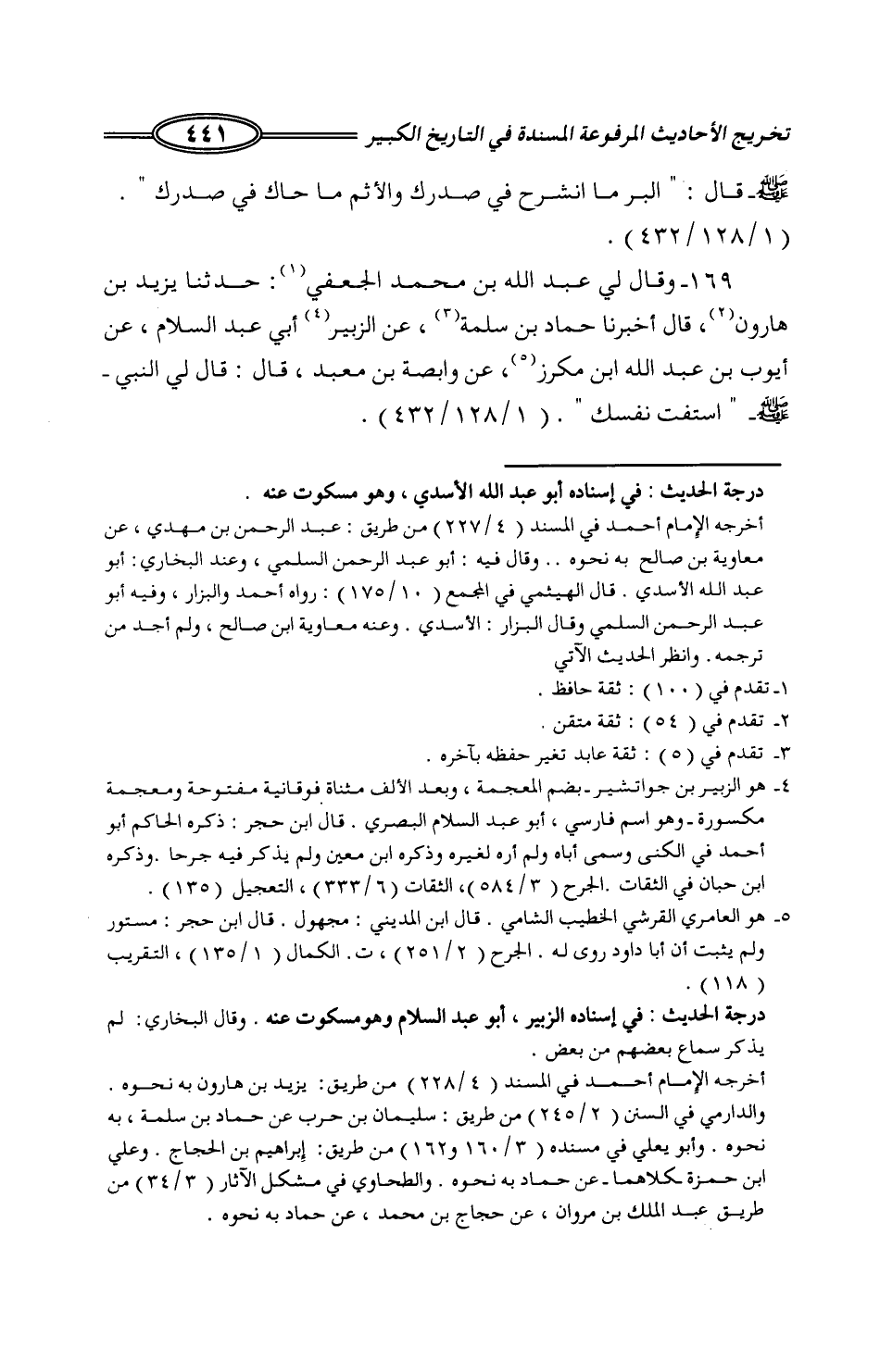 123 - وَقَالَ لِي عَبْدُ اللَّهِ بْنُ مُحَمَّدٍ الْجُعْفِيُّ: حَدَّثَنَا يَزِيدُ بْنُ هَارُونَ، قَالَ: أَخْبَرَنَا حَمَّادُ بْنُ سَلَمَةَ، عَنِ الزُّبَيْرِ أَبِي عَبْدِ السَّلَامِ، عَنْ أَيُّوبَ بْنِ عَبْدِ اللَّهِ بْنِ مِكْرَزٍ، عَنْ وَابِصَةَ بْنِ مَعْبَدٍ، قَالَ: قَالَ لِيَ النَّبِيُّ صَلَّى اللَّهُ عَلَيْهِ وَسَلَّمَ: «§اسْتَفْتِ نَفْسَكَ»