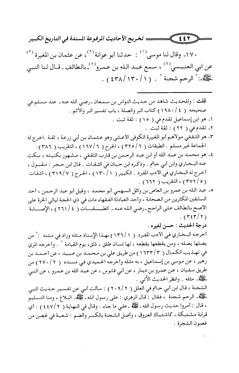 124 - وَقَالَ لَنَا مُوسَى: حَدَّثَنَا أَبُو عَوَانَةَ، عَنْ عُثْمَانَ بْنِ الْمُغِيرَةِ، عَنْ أَبِي الْعَنْبَسِيِّ، سَمِعَ عَبْدَ اللَّهِ بْنَ عَمْرٍو، بِالطَّائِفِ قَالَ لَنَا النَّبِيُّ صَلَّى اللَّهُ عَلَيْهِ وَسَلَّمَ: «§الرَّحِمُ شُجْنَةٌ» -[443]- وَقَالَ لَنَا حَجَّاجٌ: حَدَّثَنَا حَمَّادٌ، قَالَ: أَخْبَرَنَا قَتَادَةُ، عَنْ أَبِي ثُمَامَةَ الثَّقَفِيِّ، عَنْ عَبْدِ اللَّهِ بْنِ عَمْرٍو، عَنِ النَّبِيِّ صَلَّى اللَّهُ عَلَيْهِ وَسَلَّمَ فِي الرَّحِمِ
