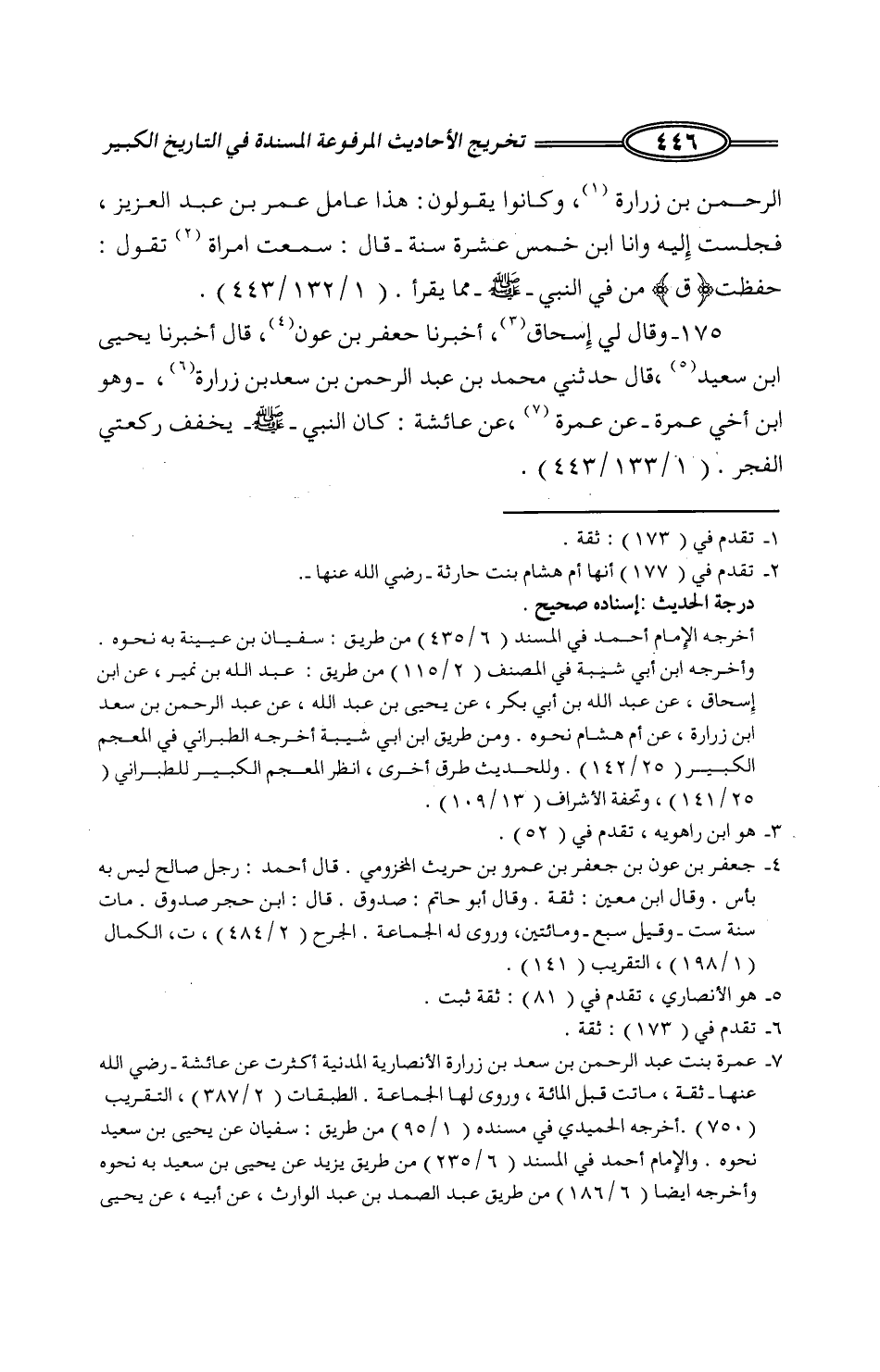 128 - وَقَالَ لِي إِسْحَاقُ: أَخْبَرَنَا جَعْفَرُ بْنُ عَوْنٍ، قَالَ: أَخْبَرَنَا يَحْيَى بْنُ سَعِيدٍ، قَالَ: حَدَّثَنِي مُحَمَّدُ بْنُ عَبْدِ الرَّحْمَنِ بْنِ سَعْدِ بْنِ زُرَارَةَ هُوَ ابْنُ أَخِي عَمْرَةَ، عَنْ عَمْرَةَ، عَنْ عَائِشَةَ، «كَانَ النَّبِيُّ صَلَّى اللَّهُ عَلَيْهِ وَسَلَّمَ §يُخَفِّفُ رَكْعَتَيِ الْفَجْرِ» -[447]- وَقَالَ لَنَا أَحْمَدُ: حَدَّثَنَا زُهَيْرٌ، قَالَ: حَدَّثَنَا يَحْيَى، عَنْ مُحَمَّدِ بْنِ عَبْدِ الرَّحْمَنِ، عَنْ عَمْرَةَ نَحْوَهُ