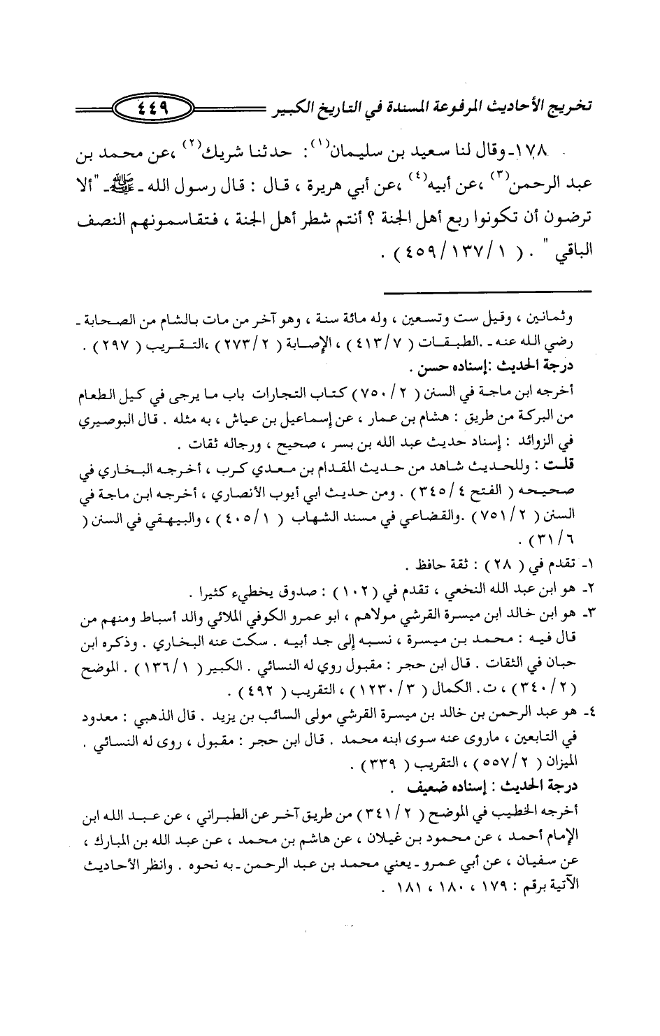 130 - وَقَالَ لَنَا سَعِيدُ بْنُ سُلَيْمَانَ: حَدَّثَنَا شَرِيكٌ، عَنْ مُحَمَّدِ بْنِ عَبْدِ الرَّحْمَنِ، عَنْ أَبِيهِ، عَنْ أَبِي هُرَيْرَةَ، قَالَ: قَالَ رَسُولُ اللَّهِ صَلَّى اللَّهُ عَلَيْهِ وَسَلَّمَ: «§أَلَا تَرْضَوْنَ أَنْ تَكُونُوا رُبْعَ أَهْلِ الْجَنَّةِ؟ أَنْتُمْ شَطْرُ أَهْلِ الْجَنَّةِ، فَتُقَاسِمُونَهُمُ النِّصْفَ الْبَاقِي» -[450]- وَقَالَ لِي عُمَرُ بْنُ مُحَمَّدٍ: حَدَّثَنَا أَبِي، قَالَ: حَدَّثَنَا شَرِيكٌ، عَنْ مُحَمَّدِ بْنِ عَمْرٍو، بِهَذَا. وَقَالَ لِي أَبُو يَحْيَى، قَالَ: ثنا الْأَسْوَدُ بْنُ عَامِرٍ، حَدَّثَنَا شَرِيكٌ، عَنْ مُحَمَّدٍ، بَيَّاعِ الْمُلَاءِ بِهَذَا. -[451]- حَدَّثَنَا آدَمُ، قَالَ: حَدَّثَنَا أَبُو عِصَامٍ، عَنْ شَرِيكٍ عَنْ مُحَمَّدٍ الطَّائِيِّ، بِهَذَا