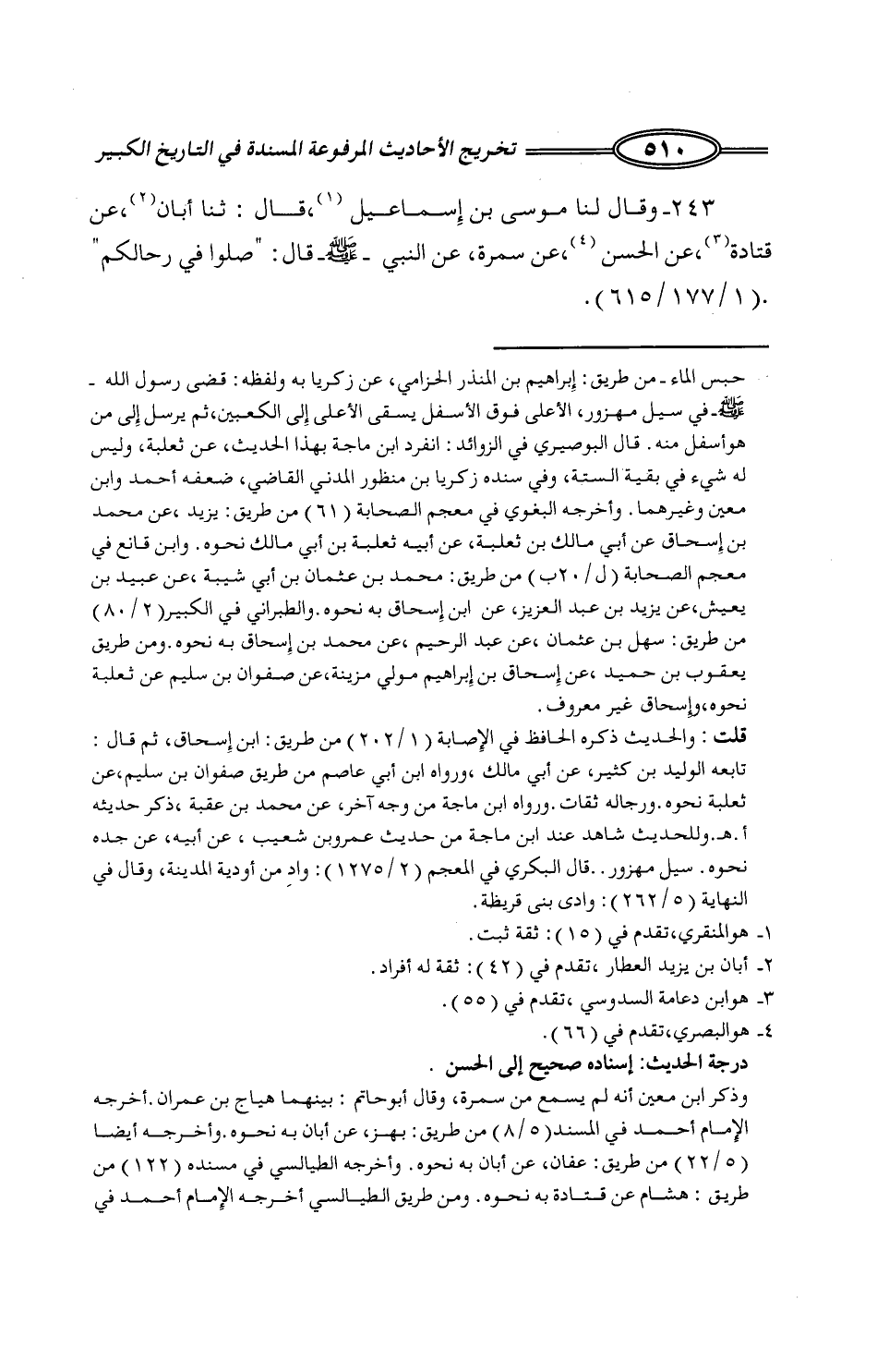172 - وَقَالَ لَنَا مُوسَى بْنُ إِسْمَاعِيلَ، قَالَ: ثنا أَبَانُ، عَنْ قَتَادَةَ، عَنِ الْحَسَنِ، عَنْ سَمُرَةَ، عَنِ النَّبِيِّ صَلَّى اللَّهُ عَلَيْهِ وَسَلَّمَ قَالَ: «§صَلُّوا فِي رِحَالِكُمْ»