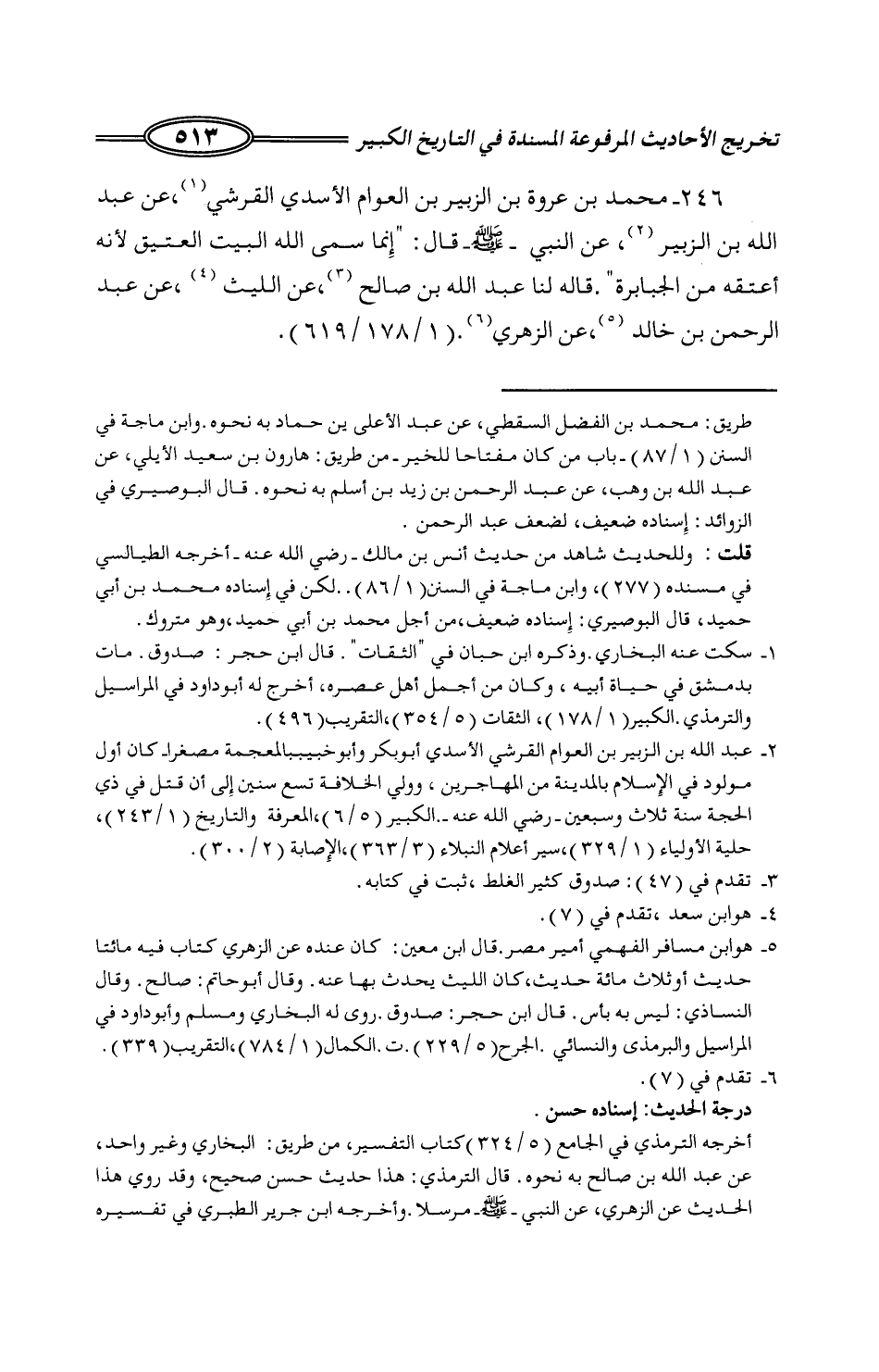174 - مُحَمَّدُ بْنُ عُرْوَةَ بْنِ الزُّبَيْرِ بْنِ الْعَوَّامِ الْأَسَدِيُّ الْقُرَشِيُّ، عَنْ عَبْدِ اللَّهِ بْنِ الزُّبَيْرِ، عَنِ النَّبِيِّ صَلَّى اللَّهُ عَلَيْهِ وَسَلَّمَ قَالَ: «إِنَّمَا §سَمَّى اللَّهُ الْبَيْتَ الْعَتِيقَ لِأَنَّهُ أَعْتَقَهُ مِنَ الْجَبَابِرَةِ» قَالَهُ لَنَا عَبْدُ اللَّهِ بْنُ صَالِحٍ: عَنِ اللَّيْثِ، عَنْ عَبْدِ الرَّحْمَنِ بْنِ خَالِدٍ، عَنِ الزُّهْرِيِّ