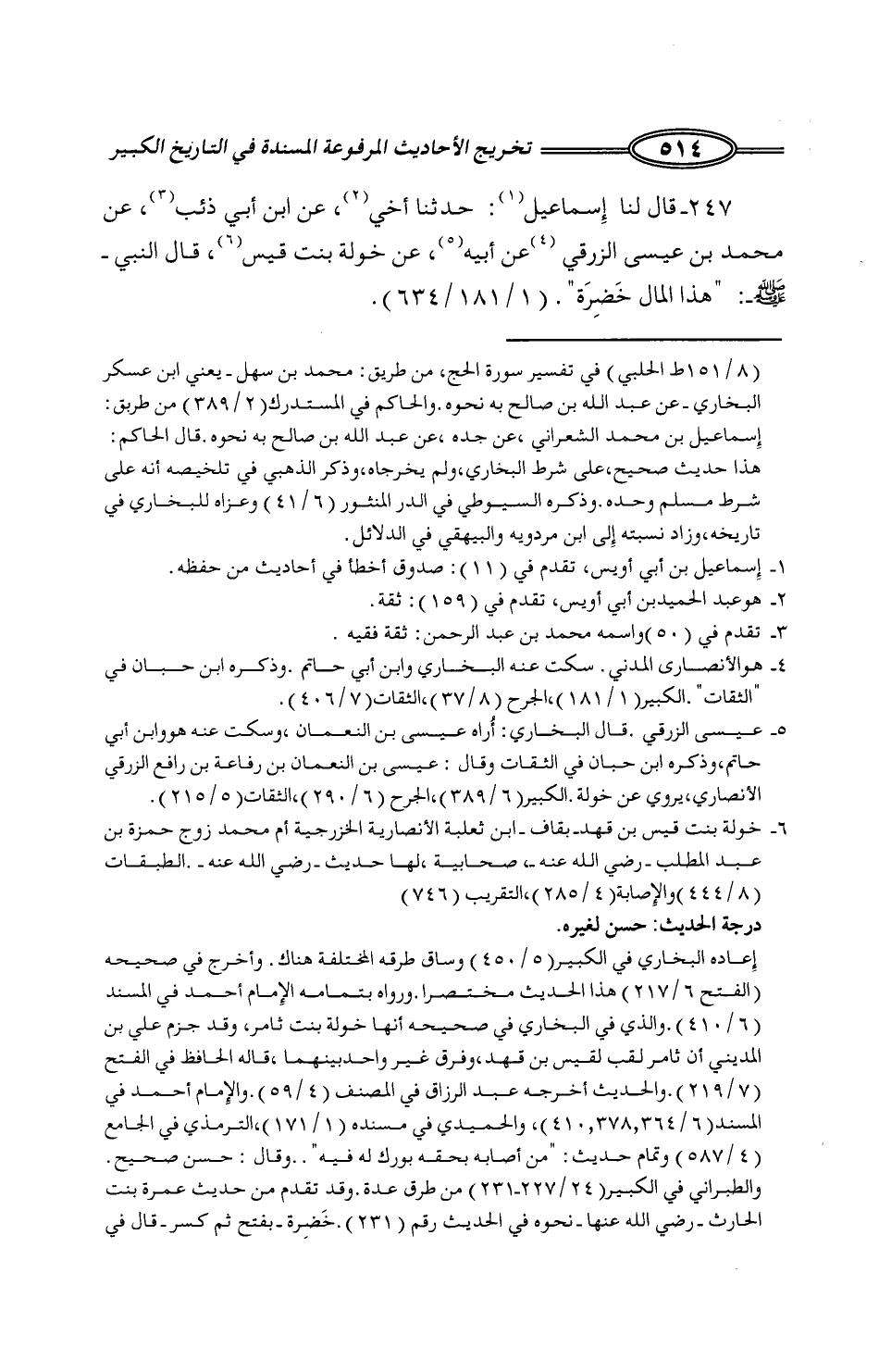 175 - قَالَ لَنَا إِسْمَاعِيلُ: حَدَّثَنَا أَخِي، عَنِ ابْنِ أَبِي ذِئْبٍ، عَنْ مُحَمَّدِ بْنِ عِيسَى الزُّرَقِيِّ، عَنْ أَبِيهِ، عَنْ خَوْلَةَ بِنْتِ قَيْسٍ، قَالَ النَّبِيُّ صَلَّى اللَّهُ عَلَيْهِ وَسَلَّمَ: «§هَذَا الْمَالُ خَضِرَةٌ» -[515]- مُحَمَّدُ بْنُ عِيسَى الْعَبْدِيُّ، سَمِعَ ابْنَ الْمُنْكَدِرِ، عَنْ جَابِرٍ فِي الْمُؤَذِّنِينَ. قَالَهُ لَنَا مُسْلِمُ بْنُ إِبْرَاهِيمَ. وَقَالَهُ لِي مُحَمَّدُ بْنُ مَعْمَرٍ: -[516]- حَدَّثَنَا سَهْلُ بْنُ حَمَّادٍ، قَالَ: حَدَّثَنَا مُحَمَّدُ بْنُ عِيسَى أَبُو يَحْيَى الْعَبْدِيُّ، قَالَ: حَدَّثَنَا مُحَمَّدُ بْنُ الْمُنْكَدِرِ بِهَذَا