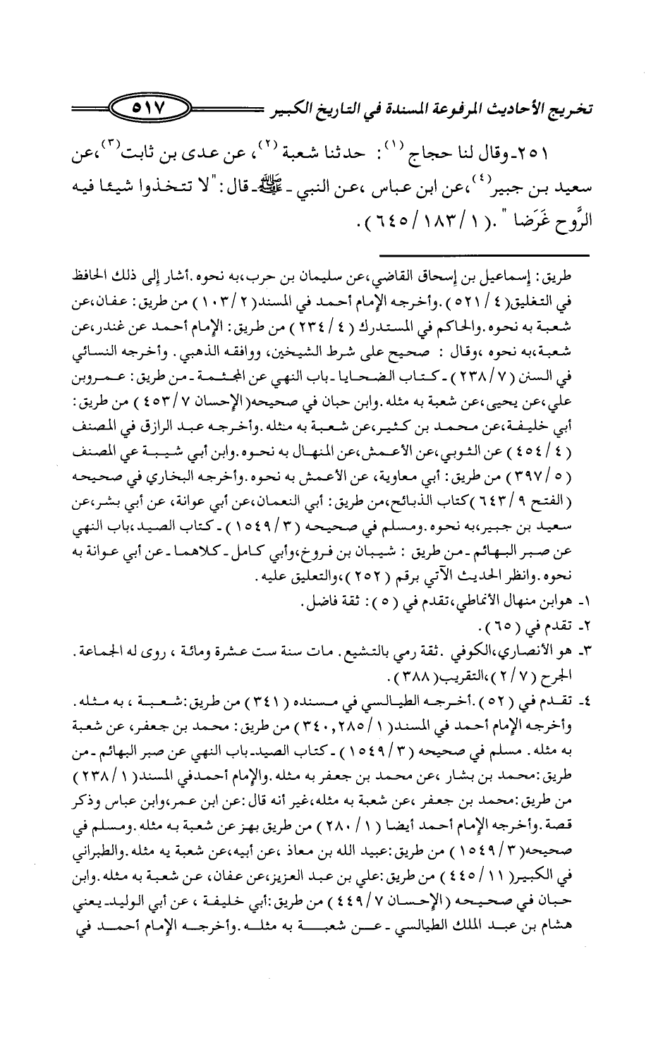 177 - وَقَالَ لَنَا حَجَّاجٌ: حَدَّثَنَا شُعْبَةُ، عَنْ عَدِيِّ بْنِ ثَابِتٍ، عَنْ سَعِيدِ بْنِ جُبَيْرٍ، عَنِ ابْنِ عَبَّاسٍ، عَنِ النَّبِيِّ صَلَّى اللَّهُ عَلَيْهِ وَسَلَّمَ قَالَ: «§لَا تَتَّخِذُوا شَيْئًا فِيهِ الرُّوحَ غَرَضًا» -[518]- وَقَالَ لِيَ الْجُعْفِيُّ: حَدَّثَنَا مُعَاوِيَةُ بْنُ عَمْرٍو، سَمِعَ أَبَا إِسْحَاقَ الْفَزَارِيَّ، عَنِ الْعَلَاءِ بْنِ الْمُسَيَّبِ، عَنِ الْفُضَيْلِ بْنِ عَمْرٍو، عَنِ ابْنِ جُبَيْرٍ، عَنِ ابْنِ عُمَرَ: لَعَنَ النَّبِيُّ صَلَّى اللَّهُ عَلَيْهِ وَسَلَّمَ مِثْلَهُ