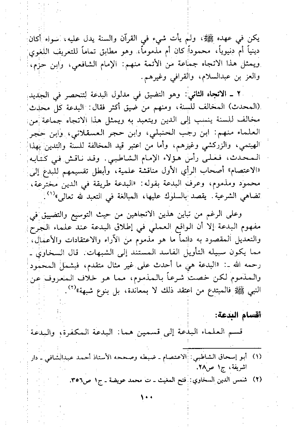 2 - الاتجاه الثاني: وهو التضيق في مدلول البدعة لتنحصر في الجديد (المحدث) المخالف للسنة، ومنهم من ضيق أكثر فقال: البدعة كل محدث مخالف للسنة ينسب إلى الدين ويتعبد به ويمثل هذا الاتجاه جماعة من العلماء منهم: ابن رجب الحنبلي، وابن حجر العسقلاني، وابن حجر الهيتمي، والزركشي وغيرهم، وأما من اعتبر قيد المخالفة للسنة والتدين بهذا المحدث، فعلى رأس هؤلاء الإمام الشاطبي. وقد ناقش في كتابه " الاعتصام " أصحاب الرأي الأول مناقشة علمية، وأبطل تقسيمهم للبدع إلى محمود ومذموم، وعرف البدعة بقوله: " البدعة طريقة في الدين مخترعة، تضاهي الشرعية. يقصد بالسلوك عليها، المبالغة في التعبد لله تعالى " (¬1) .
