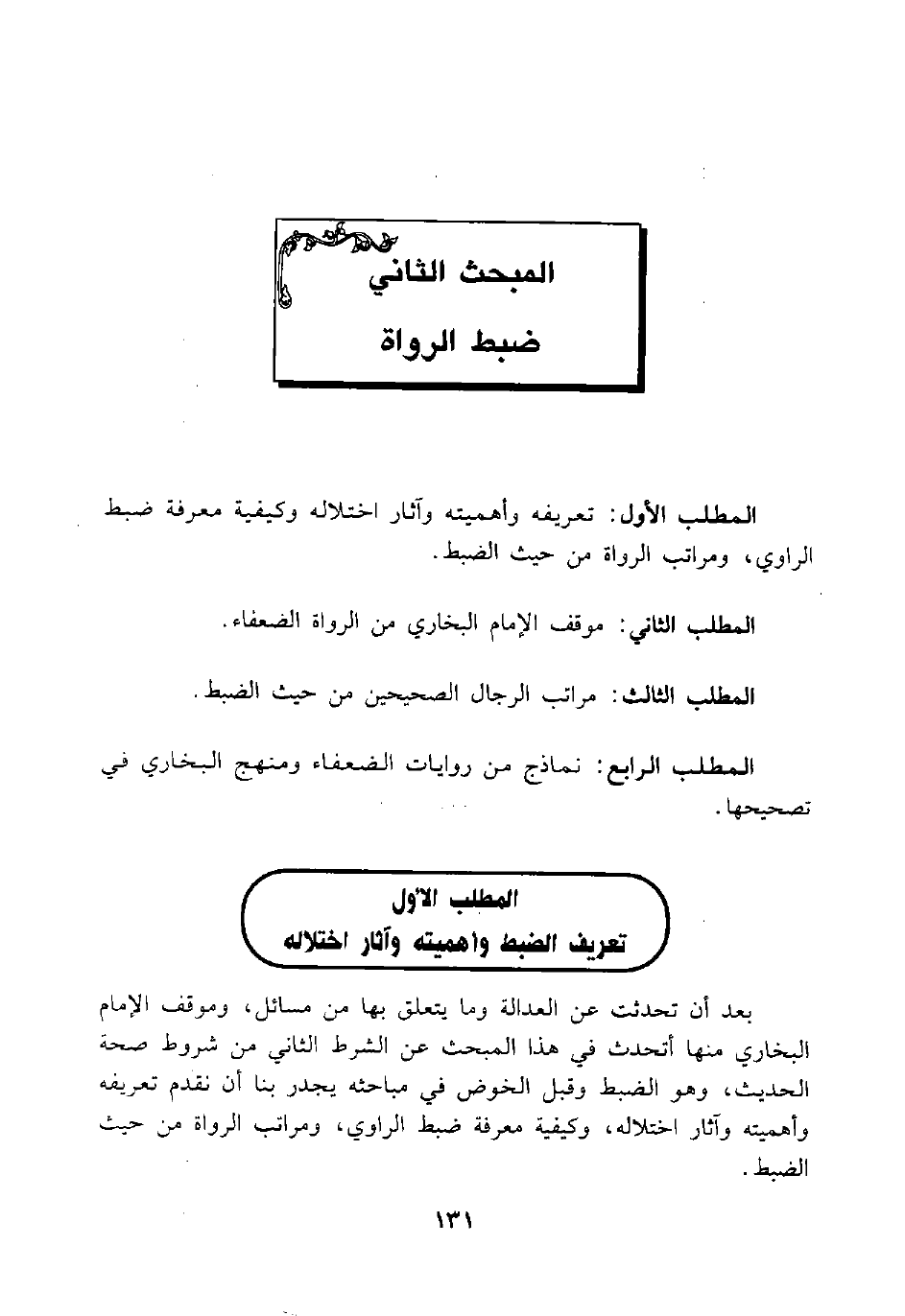 بعد أن تحدثت عن العدالة وما يتعلق بها من مسائل، وموقف الإمام البخاري منها أتحدث في هذا المبحث عن الشرط الثاني من شروط صحة الحديث، وهو الضبط وقبل الخوض في مباحثه يجدر بنا أن نقدم تعريفه وأهميته وآثار اختلاله، وكيفية معرفة ضبط الراوي، ومراتب الرواة من حيث الضبط.