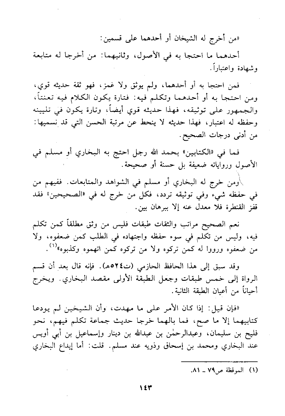 ومن خرج له البخاري أو مسلم في الشواهد والمتابعات. ففيهم من في حفظه شيء وفي توثيقه تردد، فكل من خرج له في " الصحيحين " فقد قفز القنطرة فلا معدل عنه إلا ببرهان بين.