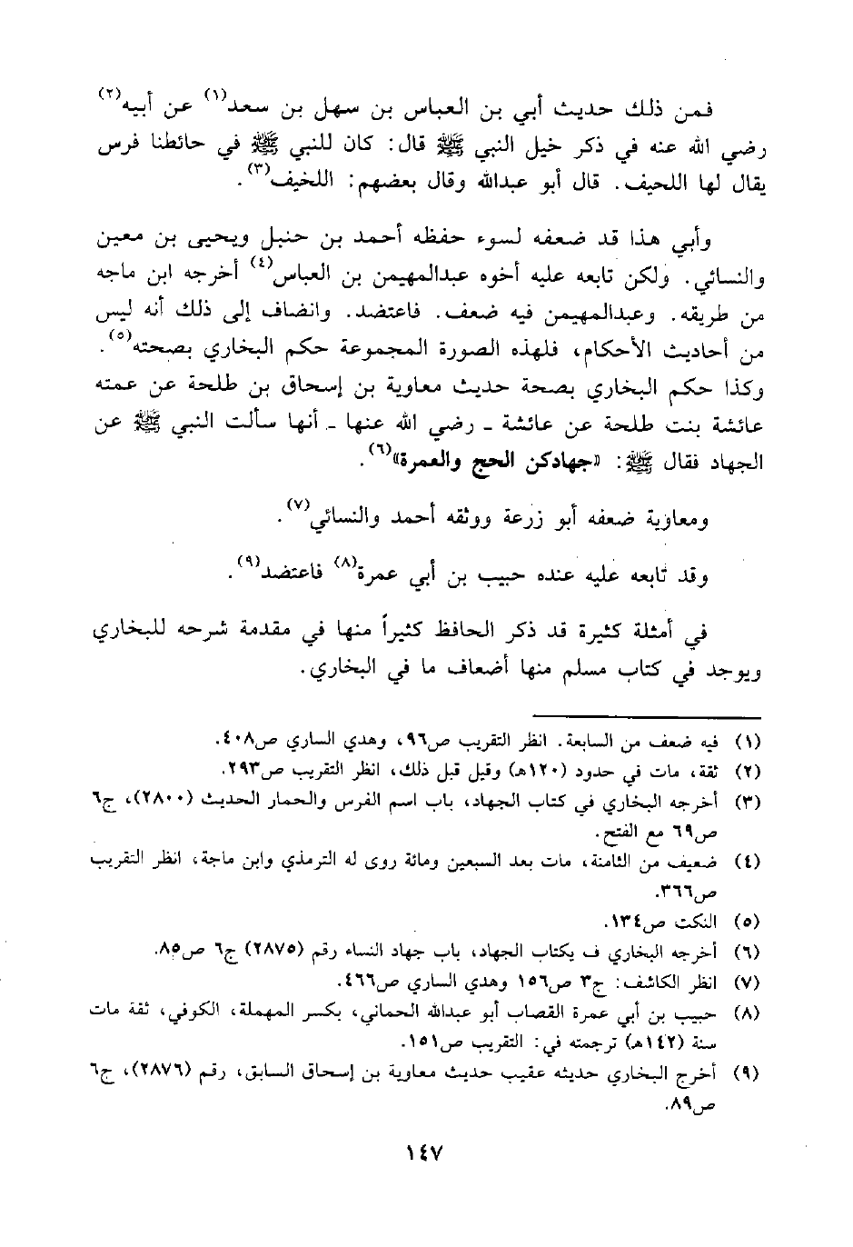 وأبي هذا قد ضعفه لسوء حفظه أحمد بن حنبل ويحي بن معين والنسائي. ولكن تابعه عليه أخوه عبد المهيمن بن العباس (¬4) أخرجه ابن ماجه من طريقه. وعبد المهيمن فيه ضعف. فاعتضد. وانضاف إلى ذلك أنه ليس من أحاديث الأحكام، فلهذه الصورة المجموعة حكم البخاري بصحته (¬5) . وكذا حكم البخاري بصحة حديث معاوية بن إسحاق بن طلحة عن عمته عائشة بنت طلحة عن عائشة - رضي الله عنها - أنها سألت النبي صلى الله عليه وسلم عن الجهاد فقال صلى الله عليه وسلم: " جهادكن الحج والعمرة " (¬6) .