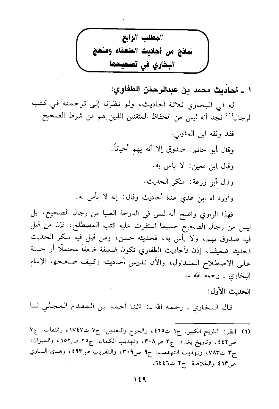 فهذا الراوي واضح أنه ليس في الدرجة العليا من رجال الصحيح، بل ليس من رجال الصحيح حسبما استقرت عليه كتب المصطلح، فإن من قيل فيه صدوق يهم، ولا بأس به، فحديثه حسن، ومن قيل فيه منكر الحديث فحديثه ضعيف، إذن فأحاديث الطفاوي تكون ضعيفة ضعفاً محتملاً أو حسنة على الاصطلاح المتداول، والآن ندرس أحاديثه وكيف صححها الإمام البخاري - رحمه الله -.