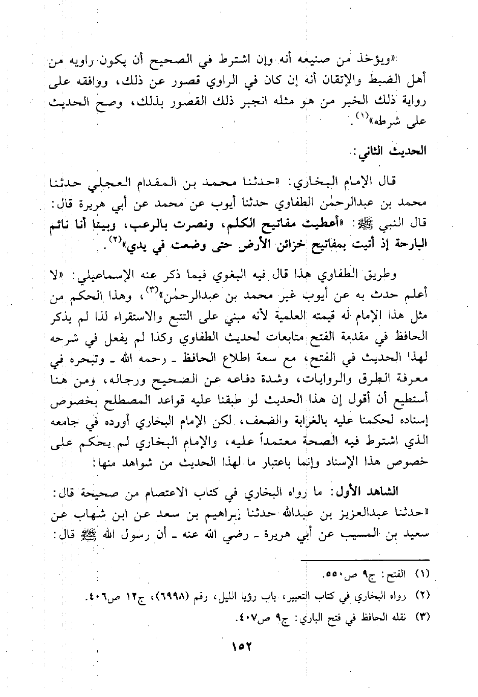قال الإمام البخاري: " حدثنا محمد بن المقدام العجلي حدثنا محمد بن عبد الرحمن الطفاوي حدثنا أيوب عن محمد عن أبي هريرة قال: قال النبي صلى الله عليه وسلم: " أعطيت مفاتيح الكلم، ونصرت بالرعب، وبينا أنا نائم البارحة إذ أتيت بمفاتيح خزائن الأرض حتى وضعت في يدي" (¬2) .