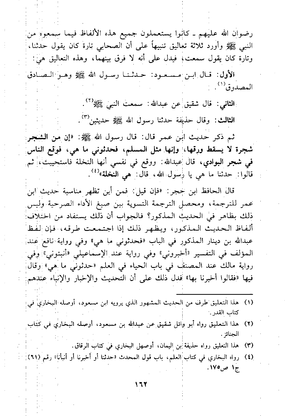 قال الحافظ ابن حجر: " فإن قيل: فمن أين تظهر مناسبة حديث ابن عمر للترجمة، ومحصل الترجمة التسوية بين صيغ الأداء الصرحية وليس ذلك بظاهر في الحديث المذكور، فالجواب أن ذلك يستفاد من اختلاف ألفاظ الحديث المذكور، ويظهر ذلك إذا اجتمعت طرقه، فإن لفظ عبد الله بن دينار المذكور في الباب " فحدثوني ما هي " وفي رواية نافع عند المؤلف في التفسير " أخبروني " وفي رواية عند الإسماعيلي " أنبئوني " وفي رواية مالك عند المصنف في باب الحياء في العلم " حدثوني ما هي " وقال فيها " فقالوا أخبرنا بها " فدل ذلك على أن التحديث والإخبار والإنباء عندهم
