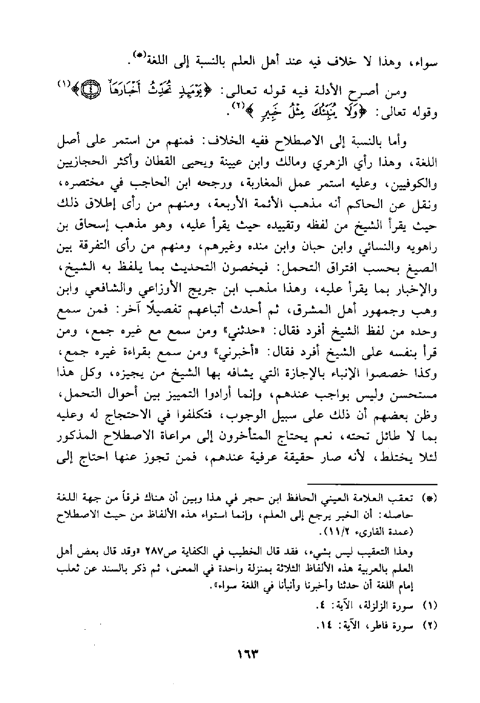 (*) تعقب العلامة العيني الحافظ ابن حجر في هذا وبين أن هناك فرقاً من جهة اللغة حاصلة: أن الخبر يرجع إلى العلم، وإنما استواء هذه الألفاظ من حيث الاصطلاح (عمدة القارئ 2/ 11) .