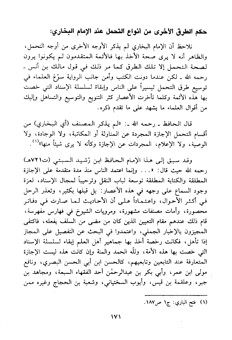 نلاحظ أن الإمام البخاري لم يذكر الأوجه الأخرى من أوجه التحمل، والظاهر أنه لا يرى صحة الأخذ بها فالأئمة المتقدمون لم يكونوا يرون لصحة التحمل إلا تلك الطرق كما مر ذلك في قول مالك بن أنس - رحمه الله - لكن عندما دونت الكتب وأمن جانب الرواية سوّغ العلماء في توسيع طرق التحمل تيسيراً على الناس وإبقاءً لسلسلة الإسناد التي خصت بها هذه الأئمة وكلما تأخرت الأعصار كثر التنويع والتوسيع والتساهل وإليك من أقوال العلماء ما يشهد على ما تقدم ذكره.
