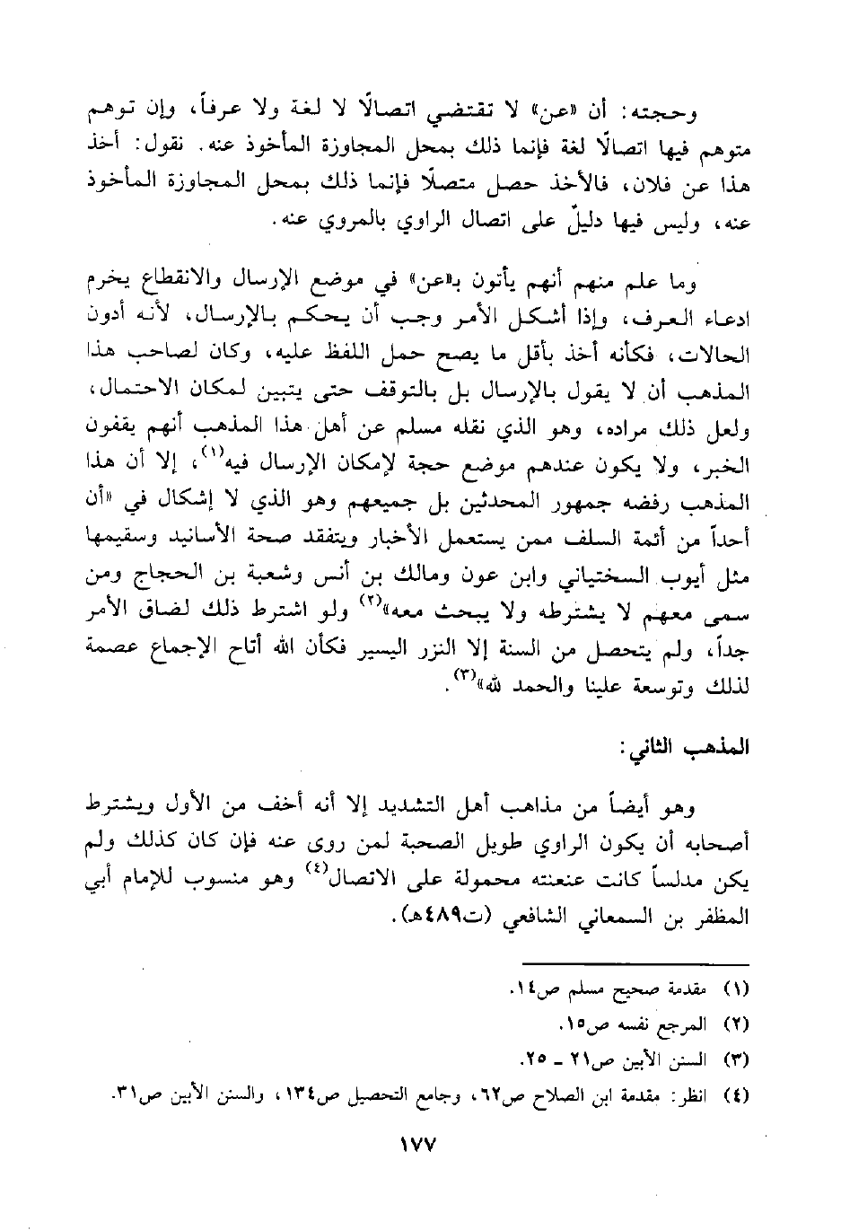 وما علم منهم أنهم يأتون بـ " عن " في موضع الإرسال والانقطاع يخرم ادعاء العرف، وإذا أشكل الأمر وجب أن يحكم بالإرسال، لأنه أدون الحالات، فكأنه أخذ بأقل ما يصح حمل اللفظ عليه، وكان لصاحب هذا المذهب أن لا يقول بالإرسال بل بالتوقف حتى يتبين لمكان الاحتمال، ولعل ذلك مراده، وهو الذي نقله مسلم عن أهل هذا المذهب أنهم يقفون الخبر، ولا يكون عندهم موضع حجة لإمكان الإرسال فيه (¬1) ، إلا أن هذا المذهب رفضه جمهور المحدثين بل جميعهم وهو الذي لا إشكال في " أن أحداً من أئمة السلف ممن يستعمل الأخبار ويتفقد صحة الأسانيد وسقيمها مثل أيوب السختياني وابن عون ومالك بن أنس وشعبة بن الحجاج ومن سمى معهم لا يشترطه ولا يبحث معه " (¬2) ولو اشترط ذلك لضاق الأمر جداً، ولم يتحصل من السنة إلا النزر اليسير فكأن الله أتاح الإجماع عصمة لذلك وتوسعة علينا والحمد لله " (¬3) .