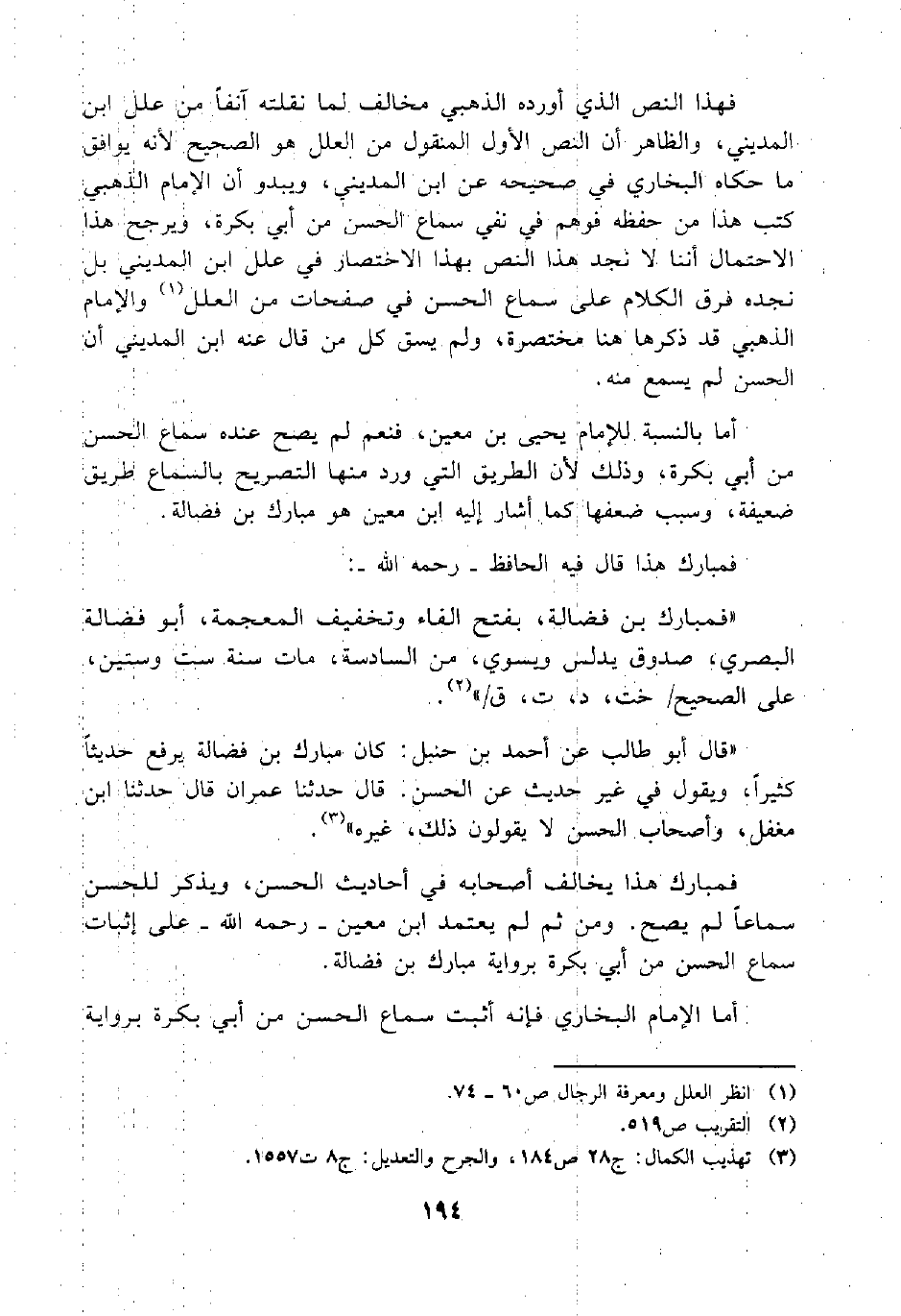 فمبارك هذا يخالف أصحابه في أحاديث الحسن، ويذكر للحسن سماعاً لم يصح. ومن ثم لم يعتمد ابن معين - رحمه الله - على إثبات سماع الحسن من أبي بكرة برواية مبارك بن فضالة.