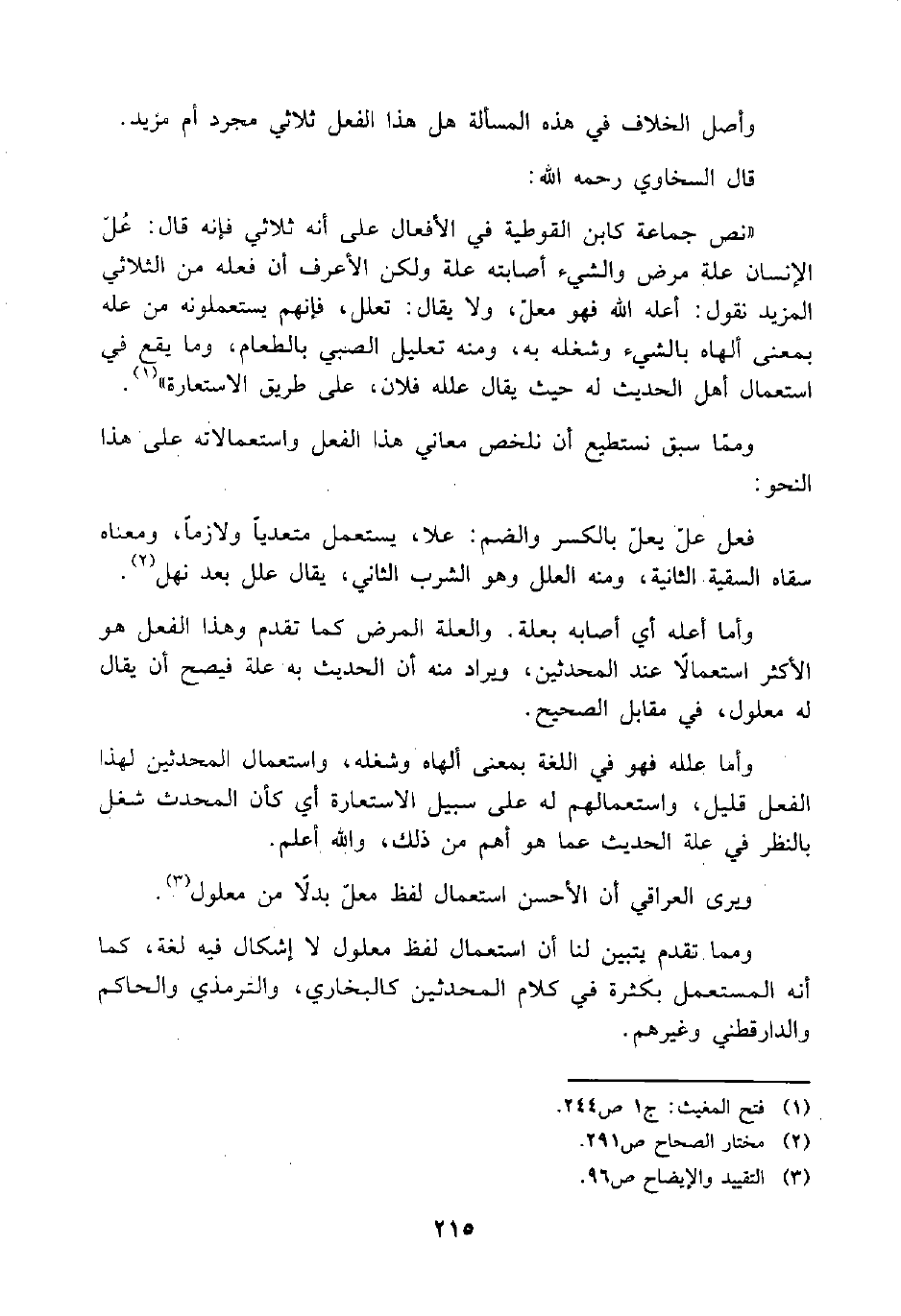 " نص جماعة كابن القوطية في الأفعال على أنه ثلاثي فإنه قال: عل الإنسان علة مرض والشيء أصابته علة ولكن الأعرف أن فعله من الثلاثي المزيد نقول: أعله الله فهو معل، ولا يقال: تعلل، فإنهم يستعملونه من علة بمعنى ألهاه بالشيء وشغله به، ومنه تعليل الصبي بالطعام، وما يقع في استعمال أهل الحديث له حيث يقال علله فلان، على طريق الاستعارة" (¬1) .