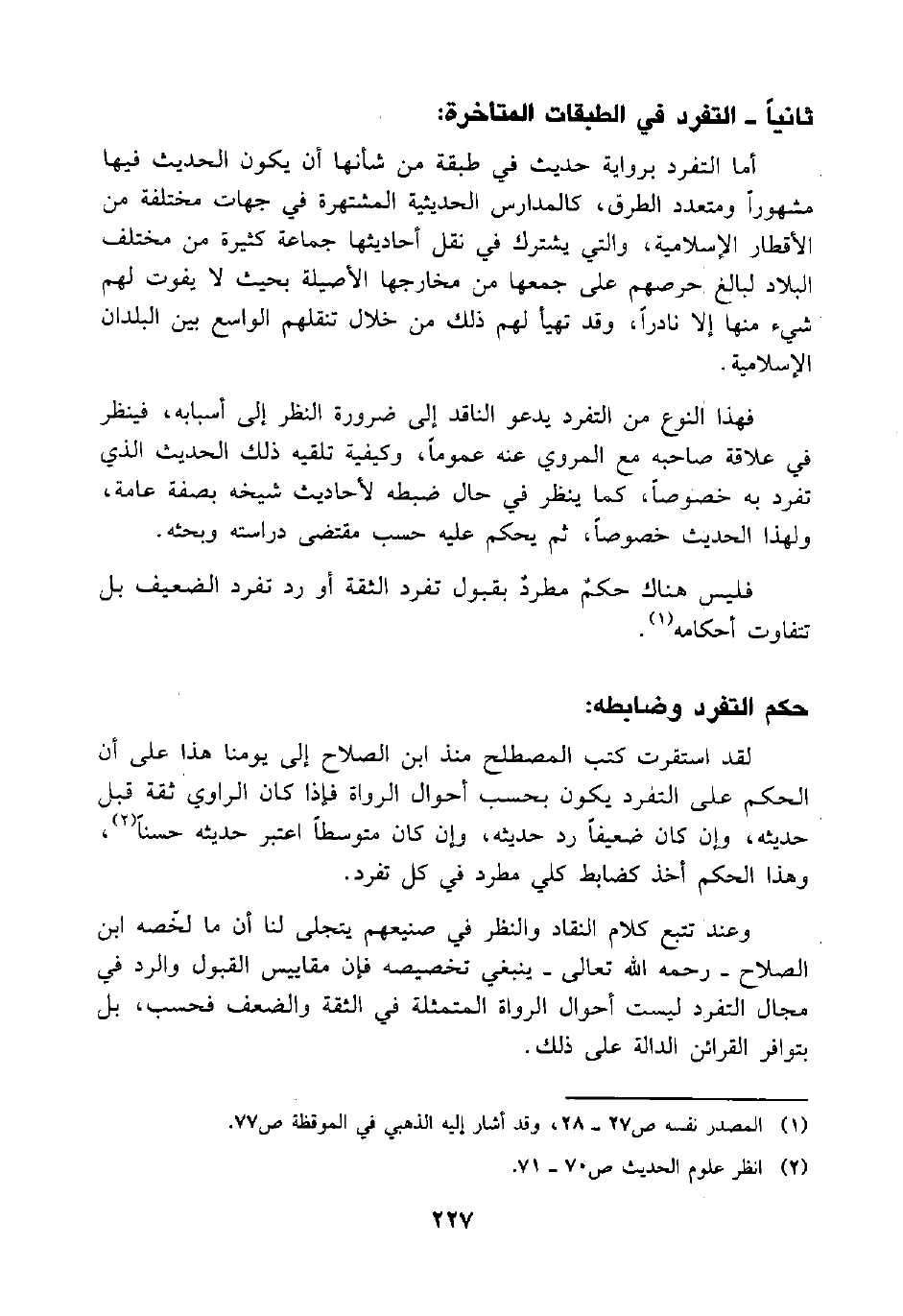 وعند تتبع كلام النقاد والنظر في صنيعهم يتجلى لنا أن ما لخصه ابن الصلاح - رحمه الله تعالى - ينبغي تخصيصه فإن مقاييس القبول والرد في مجال التفرد ليست أحوال الرواة المتمثلة في الثقة والضعف فحسب، بل بتوافر القرائن الدالة على ذلك.