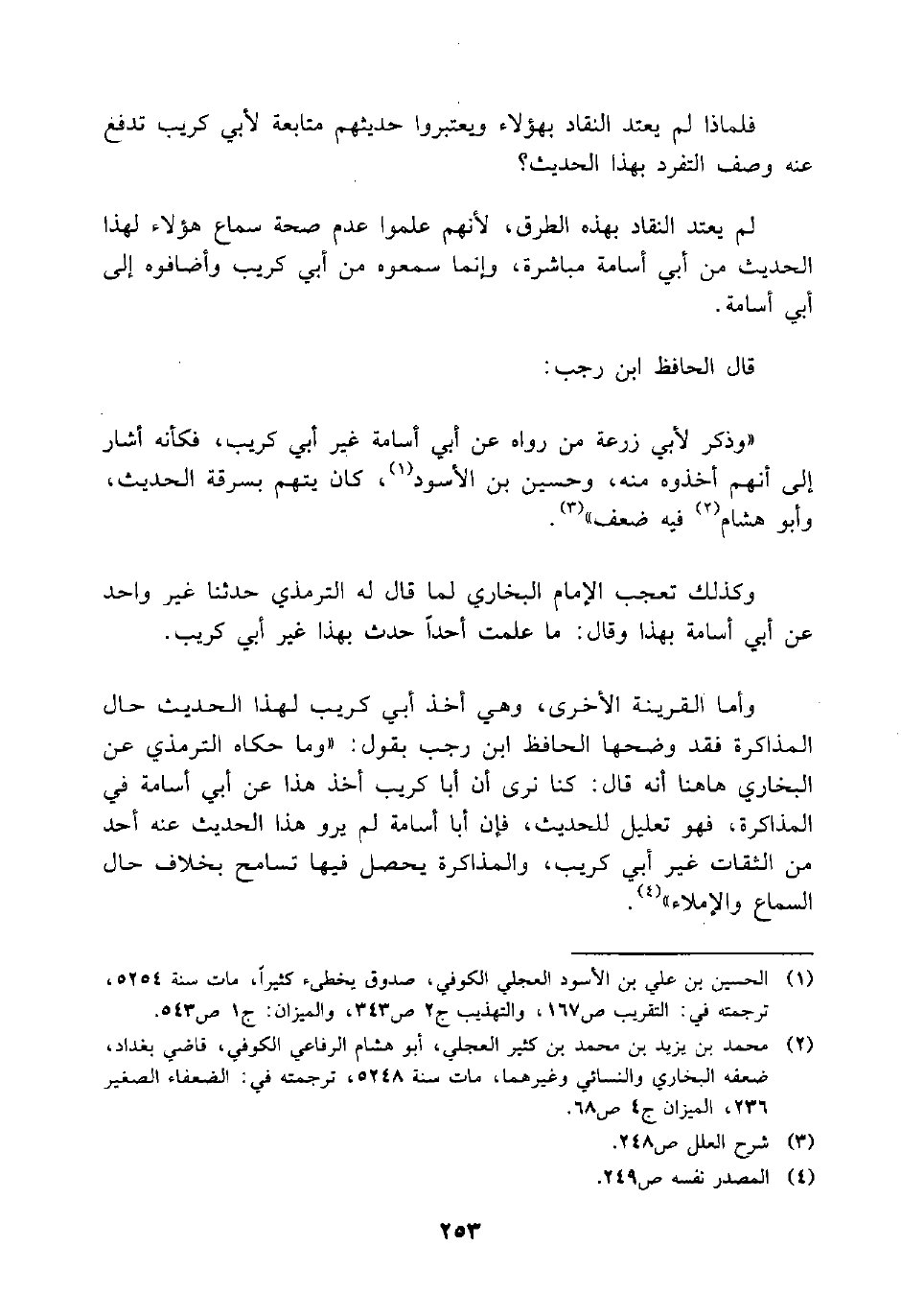 وأما القرينة الأخرى، وهي أخذ أبي كريب لهذا الحديث حال المذاكرة فقد وضحها الحافظ ابن رجب يقول: "وما حكاه الترمذي عن البخاري هاهنا أنه قال: كنا نرى أن أبا كريب أخذ هذا عن أبي أسامة في المذاكرة، فهو تعليل للحديث، فإن أبا أسامة لم يرو هذا الحديث عنه أحد من الثقات غير أبي كريب، والمذاكرة يحصل فيها تسامح بخلاف حال السماع والإملاء" (¬4) .