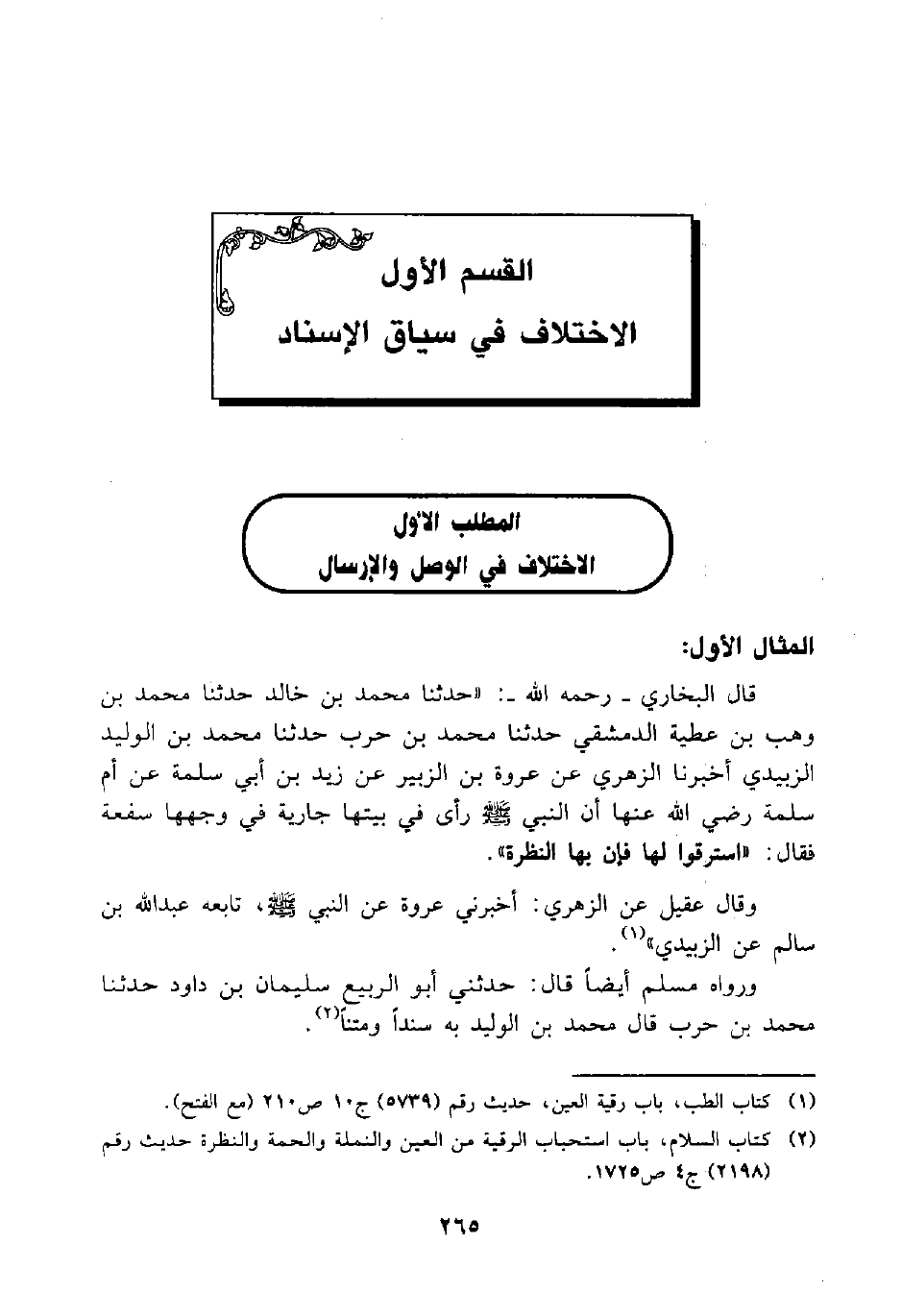 قال البخاري - رحمه الله -: "حدثنا محمد بن خالد حدثنا محمد بن وهب بن عطية الدمشقي حدثنا محمد بن حرب حدثنا محمد بن الوليد الزبيدي أخبرنا الزهري عن عروة بن الزبير عن زيد بن سلمة عن أم سلمة رضي الله عنها أن النبي صلى الله عليه وسلم رأى في بيتها جارية في وجهها سفعة فقال: "استرقوا لها فإن بها النظرة".