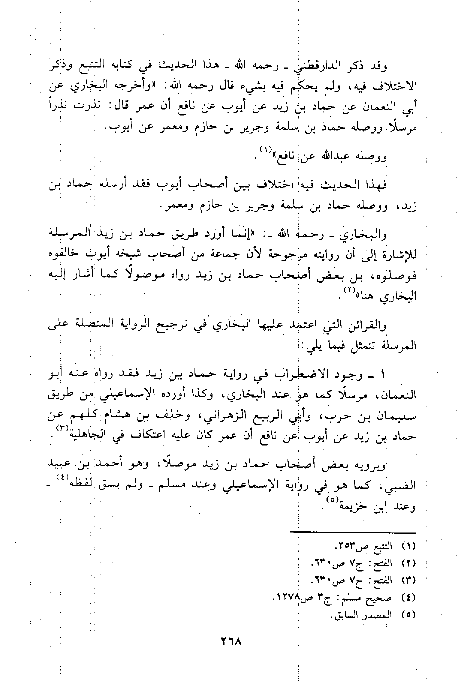 1- وجود الاضطراب في رواية حماد بن زيد فقد رواه عنه أبو النعمان، مرسلاً كما هو عند البخاري، وكذا أورده الإسماعيلي من طريق سليمان بن حرب، وأبي الربيع الزهراني، وخلف بن هشام كلهم عن حماد بن زيد عن أيوب عن نافع أن عمر كان عليه اعتكاف في الجاهلية (¬3) .