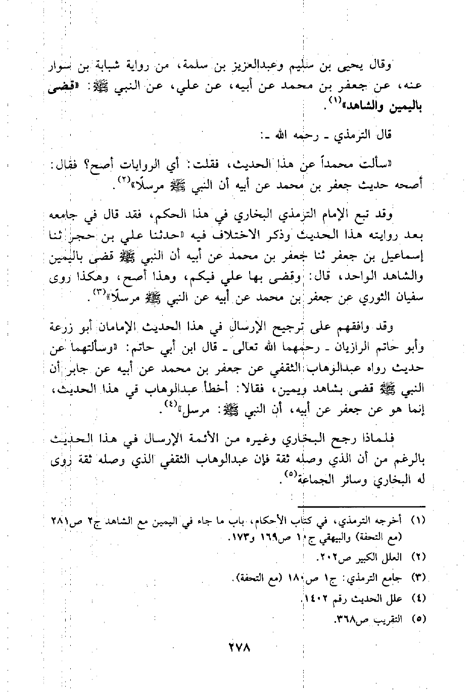 وقد وافقهم على ترجيح الإرسال في هذا الحديث الإمامان أبو زرعة وأبو حاتم الرازيان –رحمهما الله تعالى- قال ابن أبي حاتم: "وسألتهما عن حديث رواه عبد الوهاب الثقفي عن جعفر بن محمد عن أبيه عن جابر أن النبي صلى الله عليه وسلم قضى بشاهد ويمين، فقالا: أخطأ عبد الوهاب في هذا الحديث، إنما هو عن جعفر عن أبيه، أن النبي صلى الله عليه وسلم: مرسلاً" (¬4) .