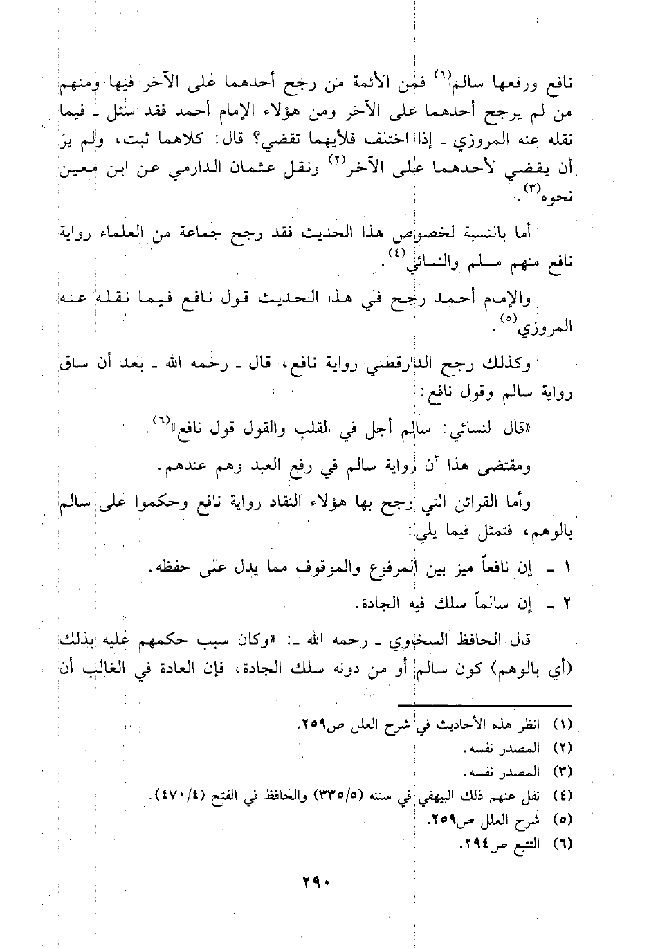 نافع ورفعها سالم (¬1) فمن الأئمة من رجح أحدهما على الآخر فيها ومنهم من لم يرجح أحدهما على الآخر ومن هؤلاء الإمام أحمد فقد سئل – فيما نقله عنه المروزي – إذا اختلف فلأيهما تقضي؟ قال: كلاهما ثبت، ولم ير أن يقضي لأحدهما على الآخر (¬2) ونقل عثمان الدرامي عن ابن معين نحوه (¬3) .