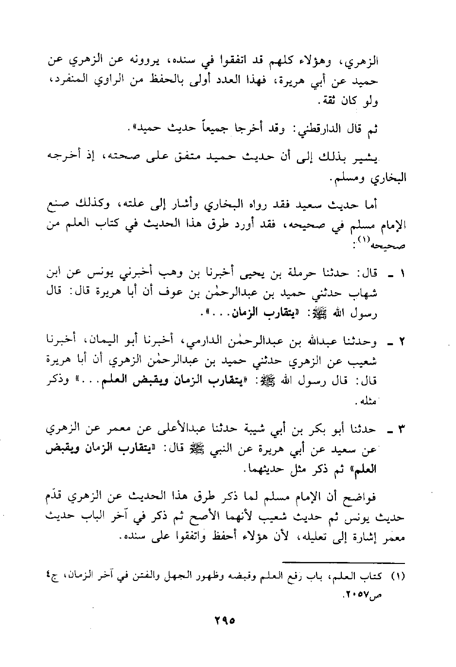 1- قال: حدثنا حرملة بن يحيى أخبرنا بن وهب أخبرني يونس عن ابن شهاب حدثني حميد بن عبد الرحمن بن عوف أن أبا هريرة قال: قال رسول الله صلى الله عليه وسلم: "يتقارب الزمان".