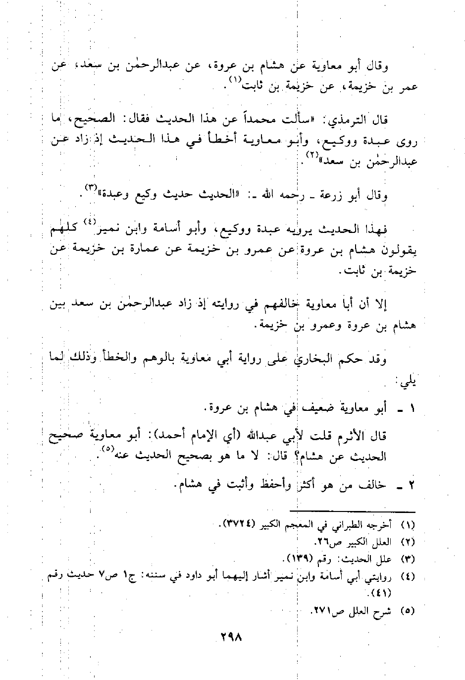 إلا أن أبا معاوية خالفهم في روايته إذ زاد عبد الرحمن بن سعد بين هشام بن عروة وعمرو بن خزيمة.