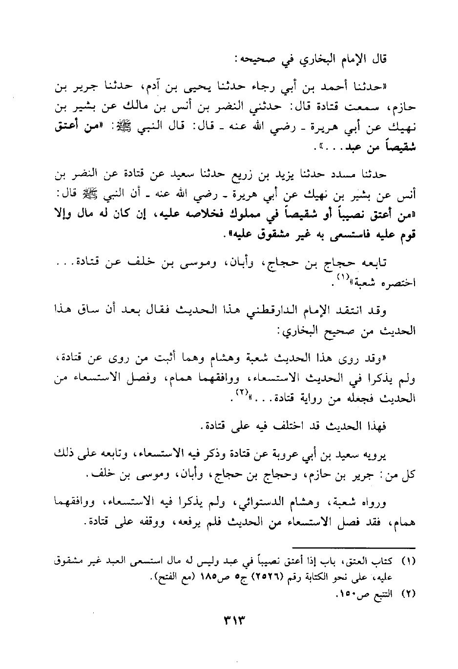 "حدثنا أحمد بن أبي رجاء حدثنا يحيى بن آدم، حدثنا جرير بن حازم، سمعت قتادة قال: حدثني النضر بن أنس بن مالك عن بشير بن نهيك عن أبي هريرة – رضي الله عنه – قال: قال النبي صلى الله عليه وسلم: "من أعتق شقيصاً من عبد ".