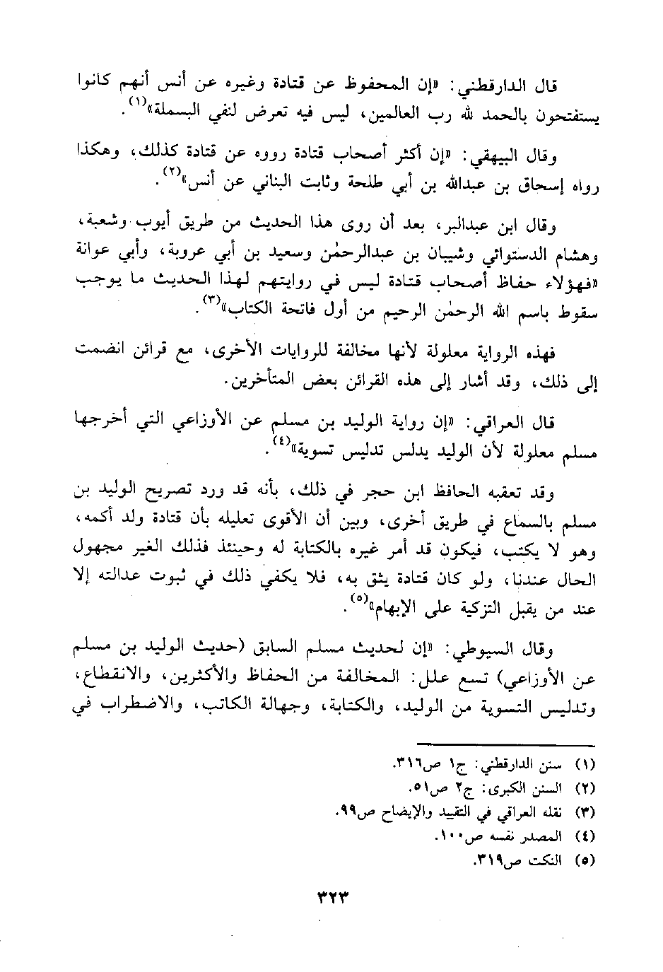 وقال ابن عبد البر، بعد أن روى هذا الحديث من طريق أيوب وشعبة، وهشام الدستوائي وشيبان بن عبد الرحمن وسعيد بن أبي عروبة، وأبي عوانة "فهؤلاء حافظ أصحاب قتادة ليس في روايتهم لهذا الحديث ما يوجب سقوط باسم الله الرحمن الرحيم من أول فاتحة الكتاب" (¬3) .