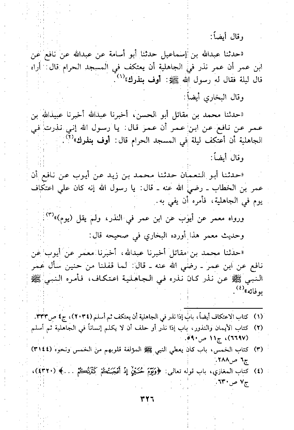 "حدثنا أبو النعمان حدثنا محمد بن زيد عن أيوب عن نافع أن عمر بن الخطاب – رضي الله عنه – قال: يا رسول الله إنه كان علي اعتكاف يوم في الجاهلية، فأمره أن يفي به.