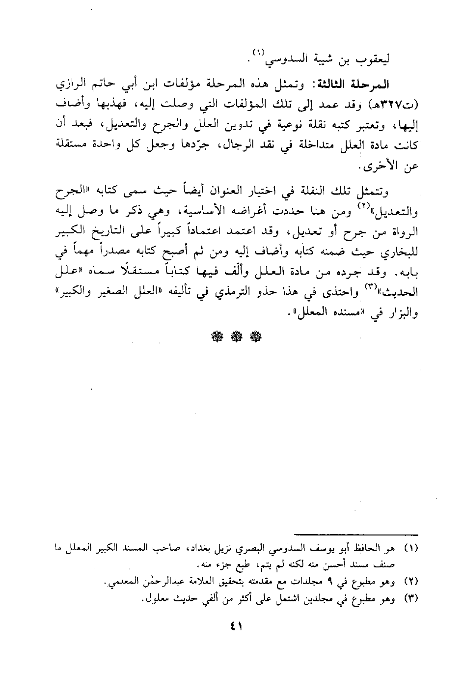 المرحلة الثالثة: وتمثل هذه المرحلة مؤلفات ابن أبي حاتم الرازي (ت 327هـ) وقد عمد إلى تلك المؤلفات التي وصلت إليه، فهذبها وأضاف إليها، وتعتبر كتبه نقلة نوعية في تدوين العلل والجرح والتعديل، فبعد أن كانت مادة العلل متداخلة في نقد الرجال، جرّدها وجعل كل واحدة مستقلة عن الأخرى.