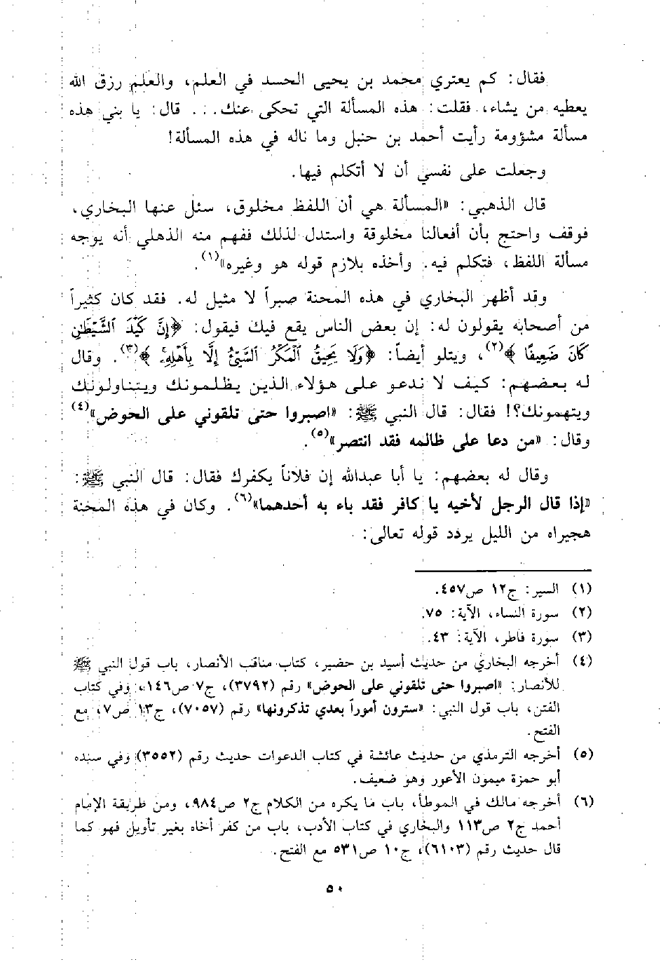 فقال: كم يعتري محمد بن يحي الحسد في العلم، والعلم رزق الله يعطيه من يشاء، فقلت: هذه المسألة التي تحكى عنك.. قال: يا بني هذه مسألة مشؤومة رأيت أحمد بن حنبل وما ناله في هذه المسألة!